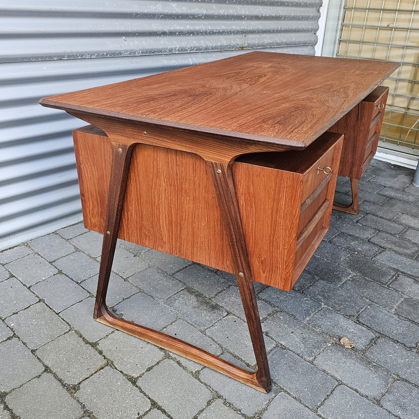 Skrivebord i teaktræ med skuffer i begge sider, øverste skuffer med nøgle
