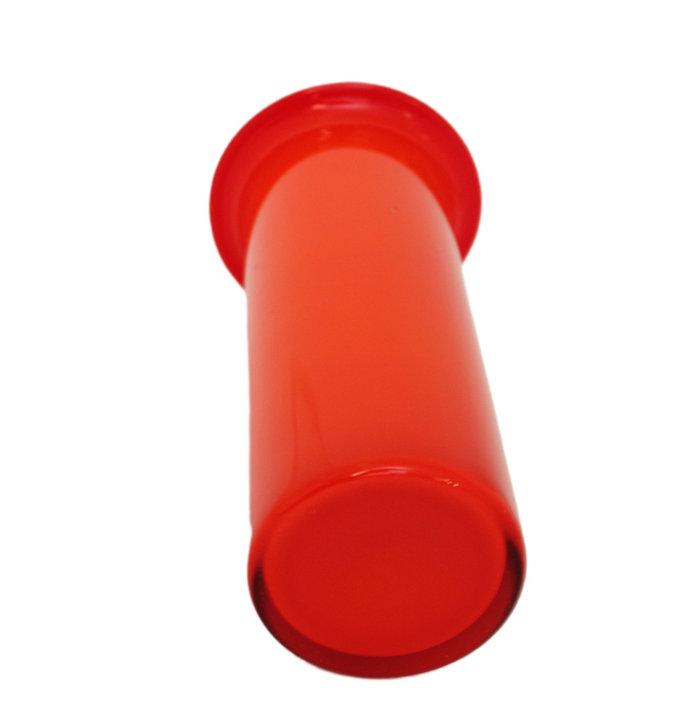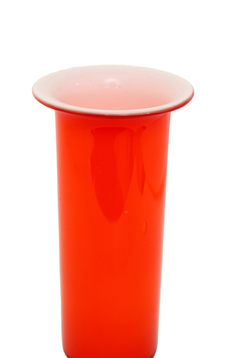 Holmegaard, Regnbue, Orange cylindrisk vase med hvidt opalglas indvendig og på den udsvajede kant. Designet af Michael Bang i 1970. Vasen har et slag midtpå og en større luftboble, se foto. Ellers i fin stand. Højde 17 cm. Øverste diameter 8 cm. Pris: 325 kr. Lager: 1