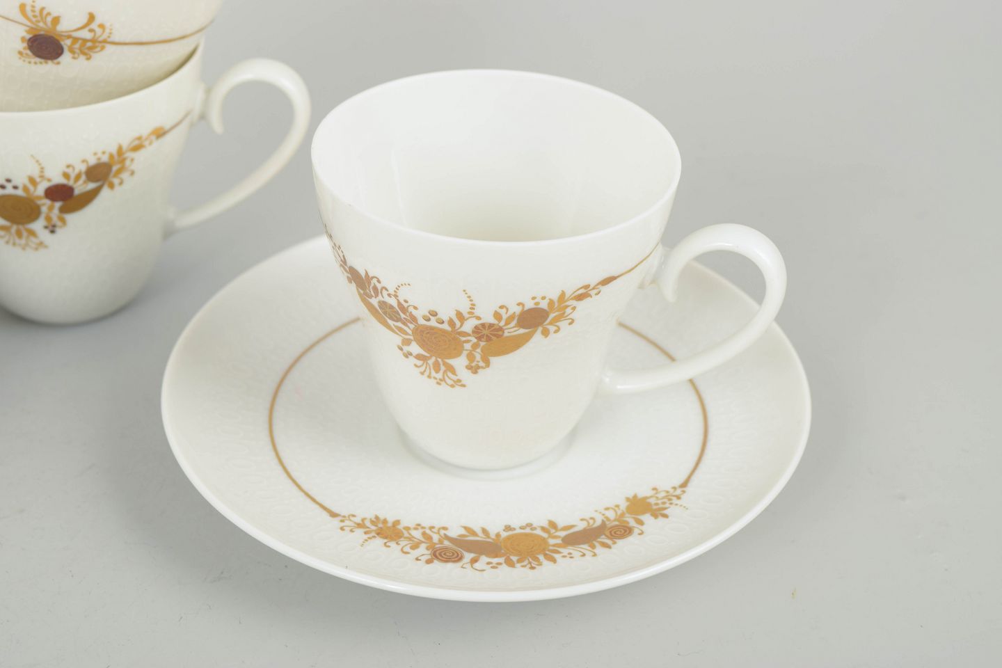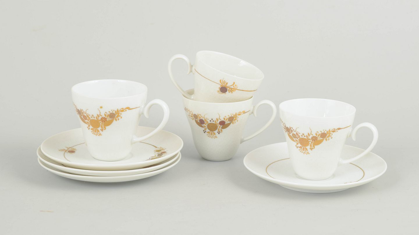 Sæt bestående af fire kaffekopper med tilhørende underkopper i porcelæn dekoreret med det karakteristiske blomsterornament fra Romanze-serien. Dekorationen fremstår i gyldne nuancer med fine detaljer og et elegant, romantisk udtryk, typisk for Wiinblads formsprog i 1970’erne.