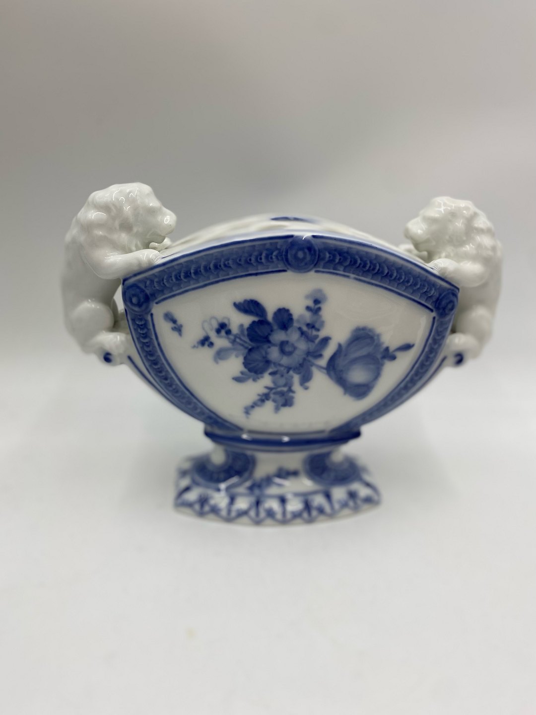 Royal Copenhagen porcelæn, blå blomst buketvase med to løve hanke. Nr. 10/1571-1572. Måler 17,5cm høj, 23cm lang. og 9cm bred. 1. sort. Hel og fin stand. Pris 8400kr.