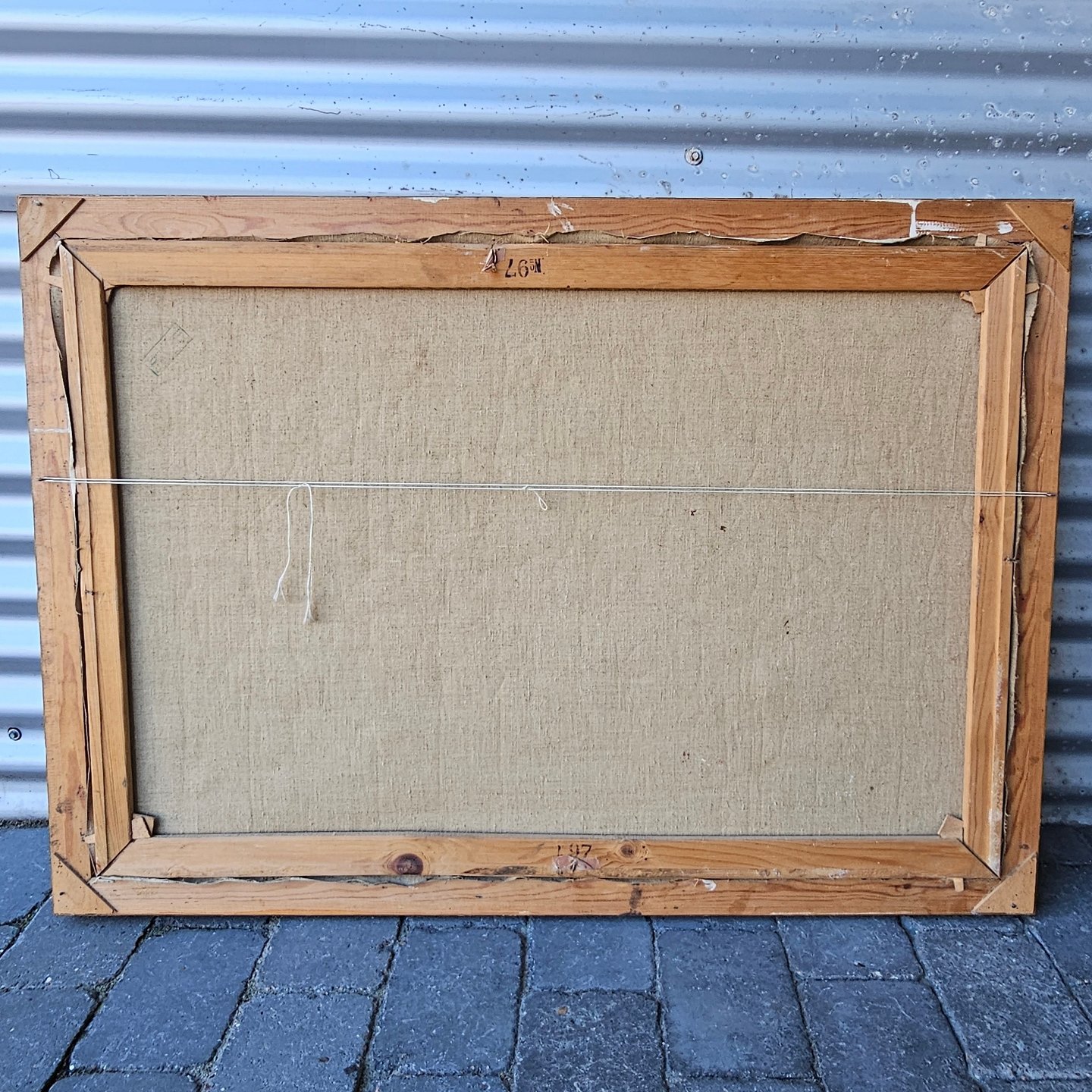 Oliemaleri på lærred med motiv af en frugtskål og en vase med vilde blomster. Monteret i guldmalet ramme