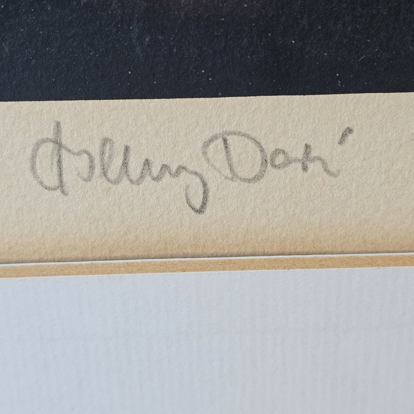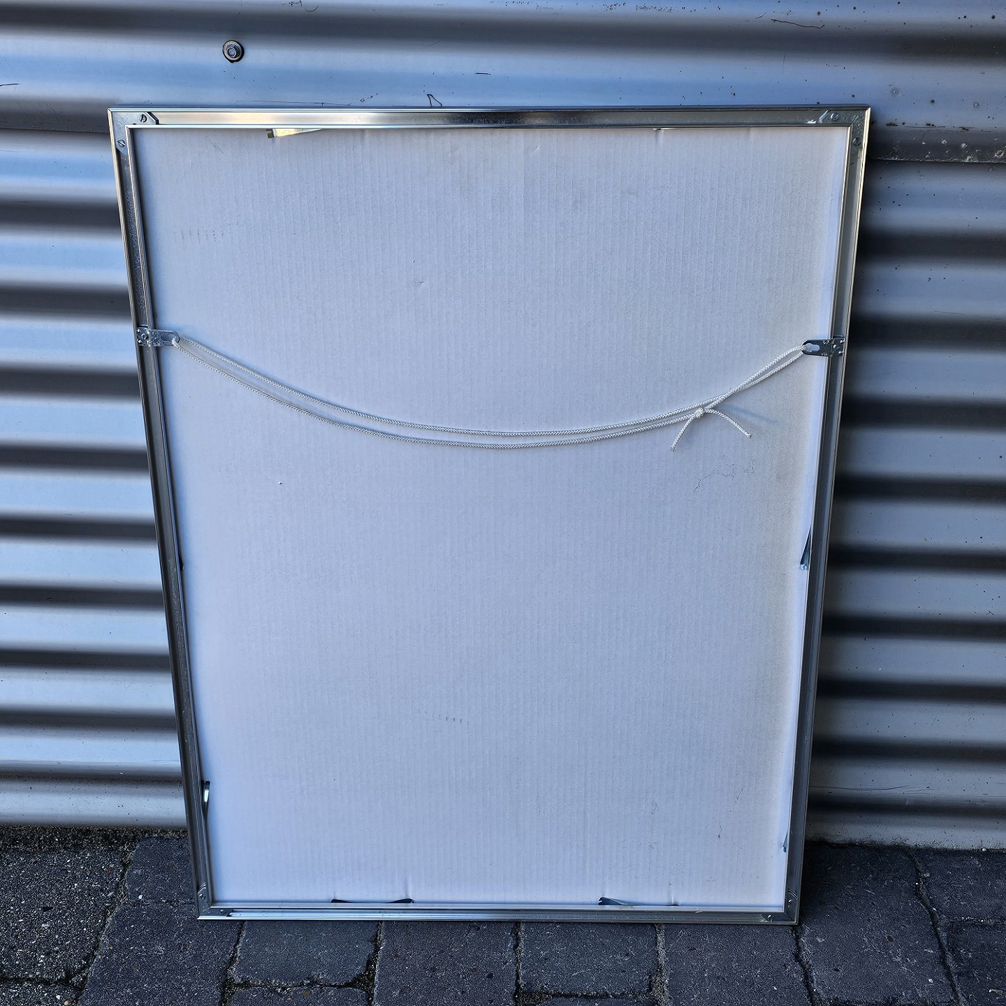 Litografi med abstrakt motiv og røde og gule nuancer monteret i metal ramme