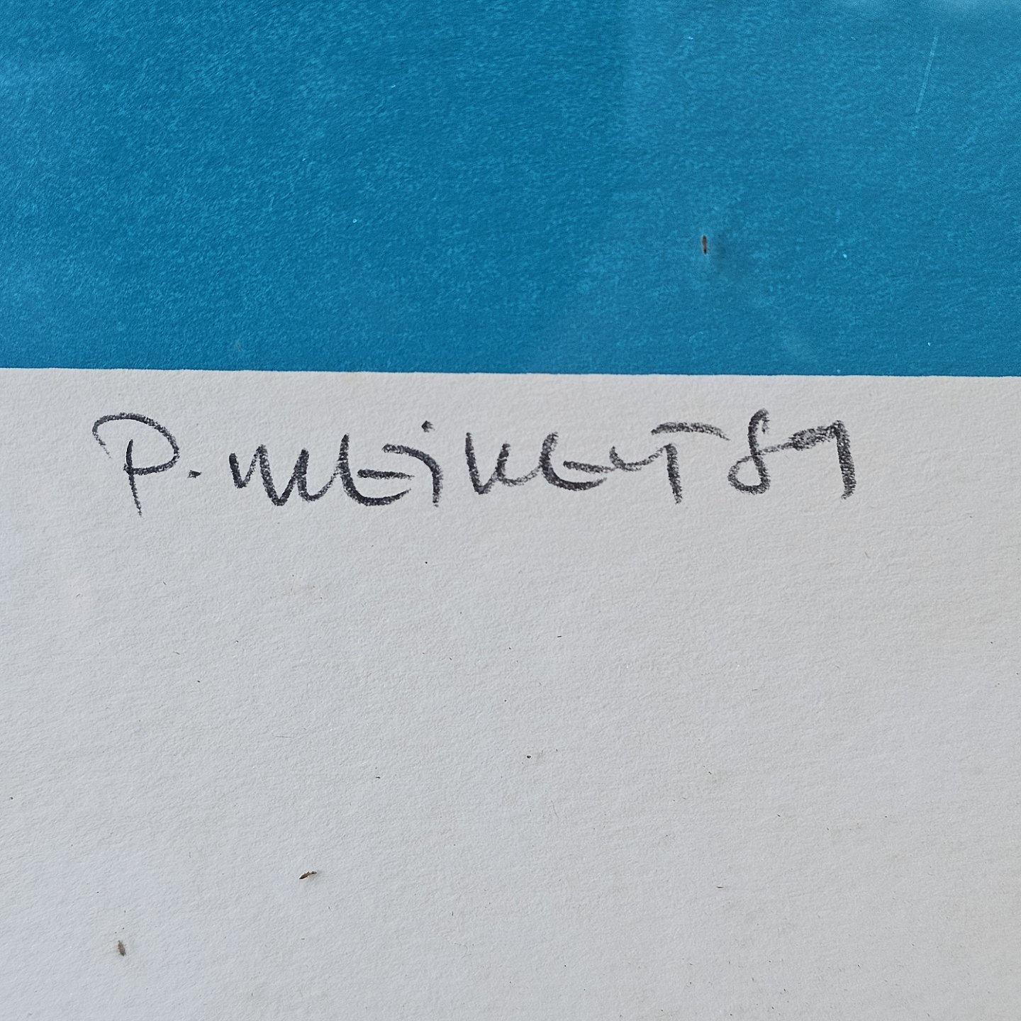Litografi med abstrakt motiv i blå, turkis og grå monteret i metalramme. Nr. 12/46 og dateret 1989