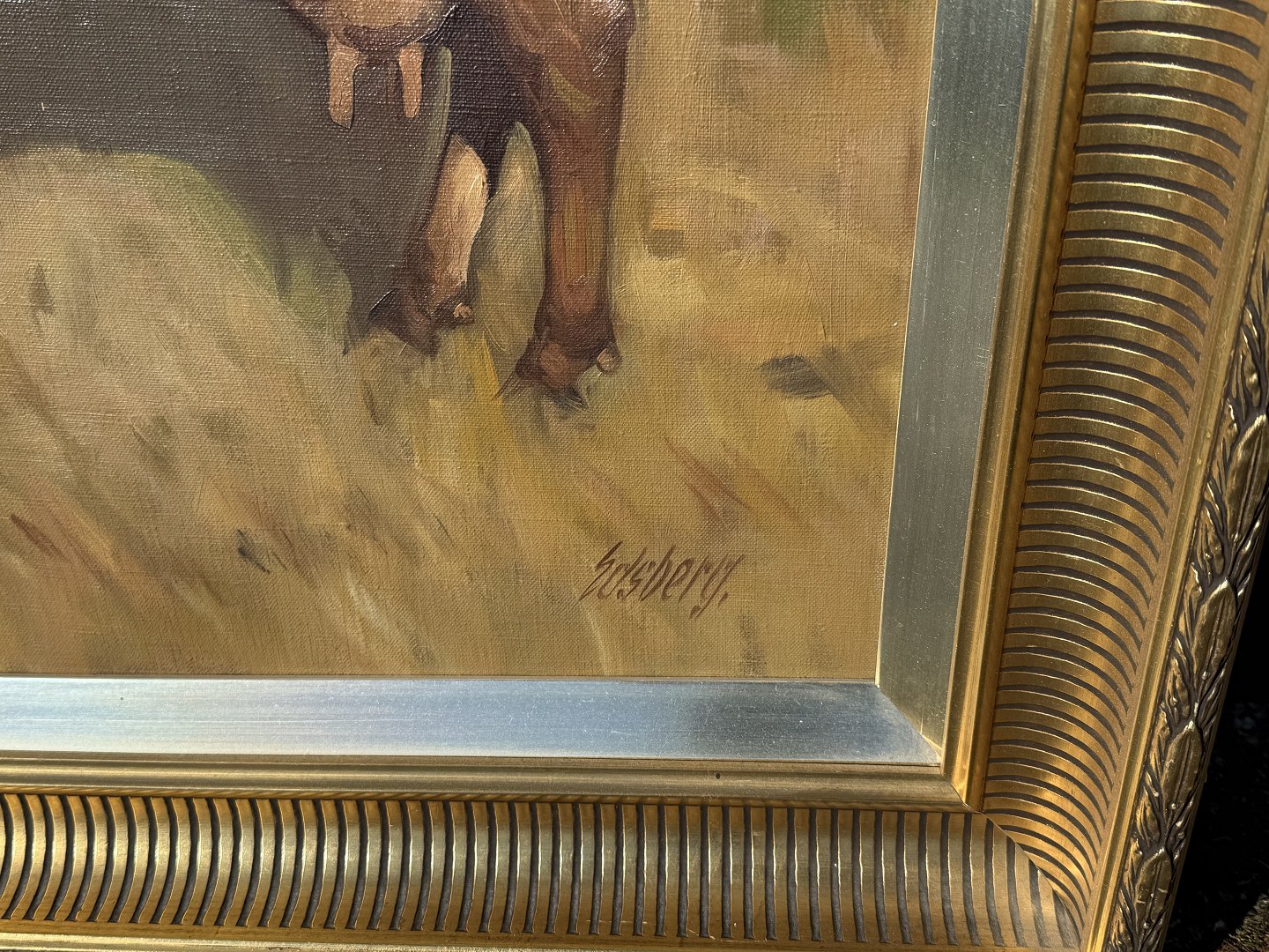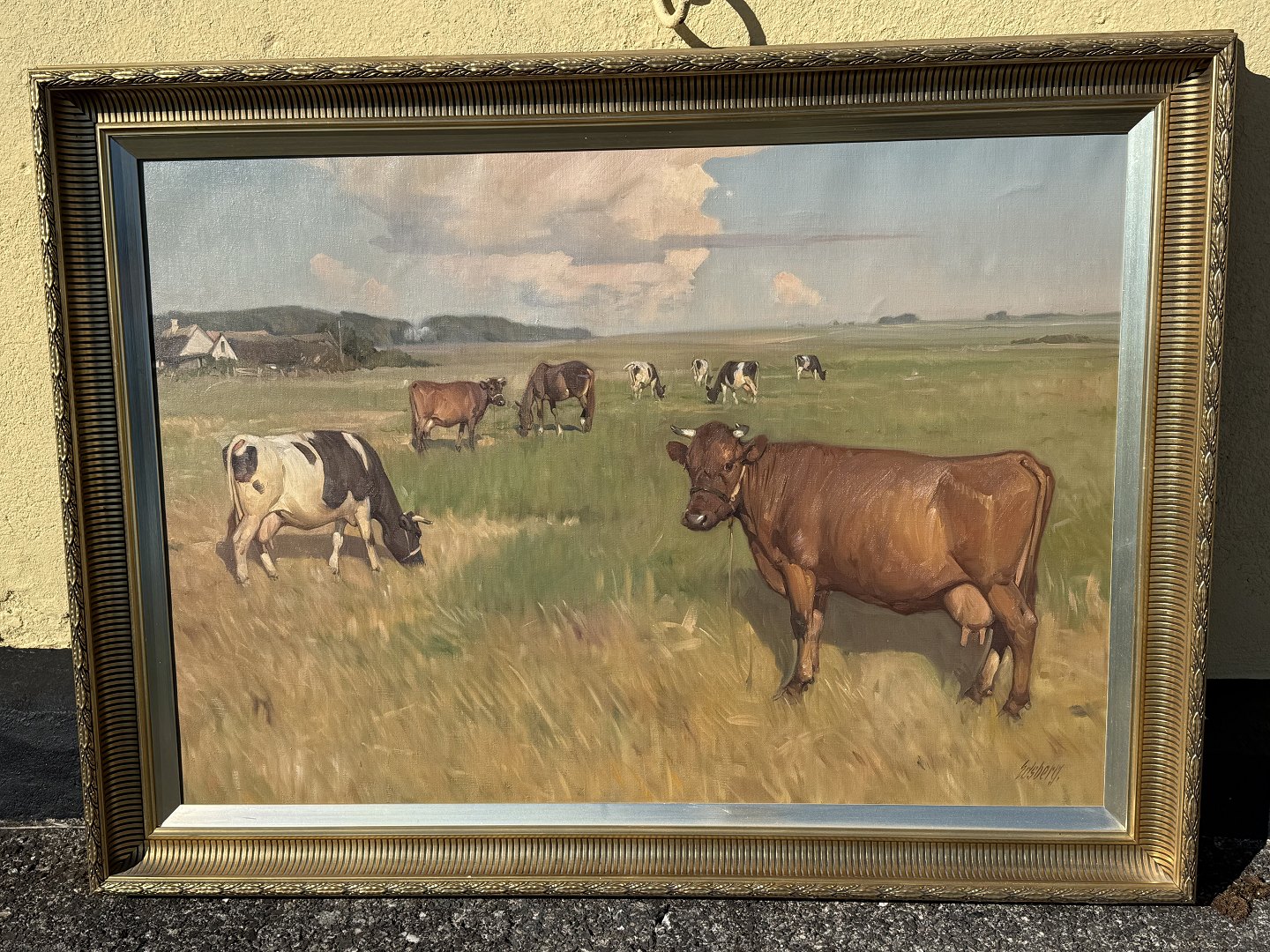 Knud Edsberg (1911-2003), Oliemaleri på lærred, køer på en mark, Mål med ramme 117x87 *Fin stand med flot ramme*