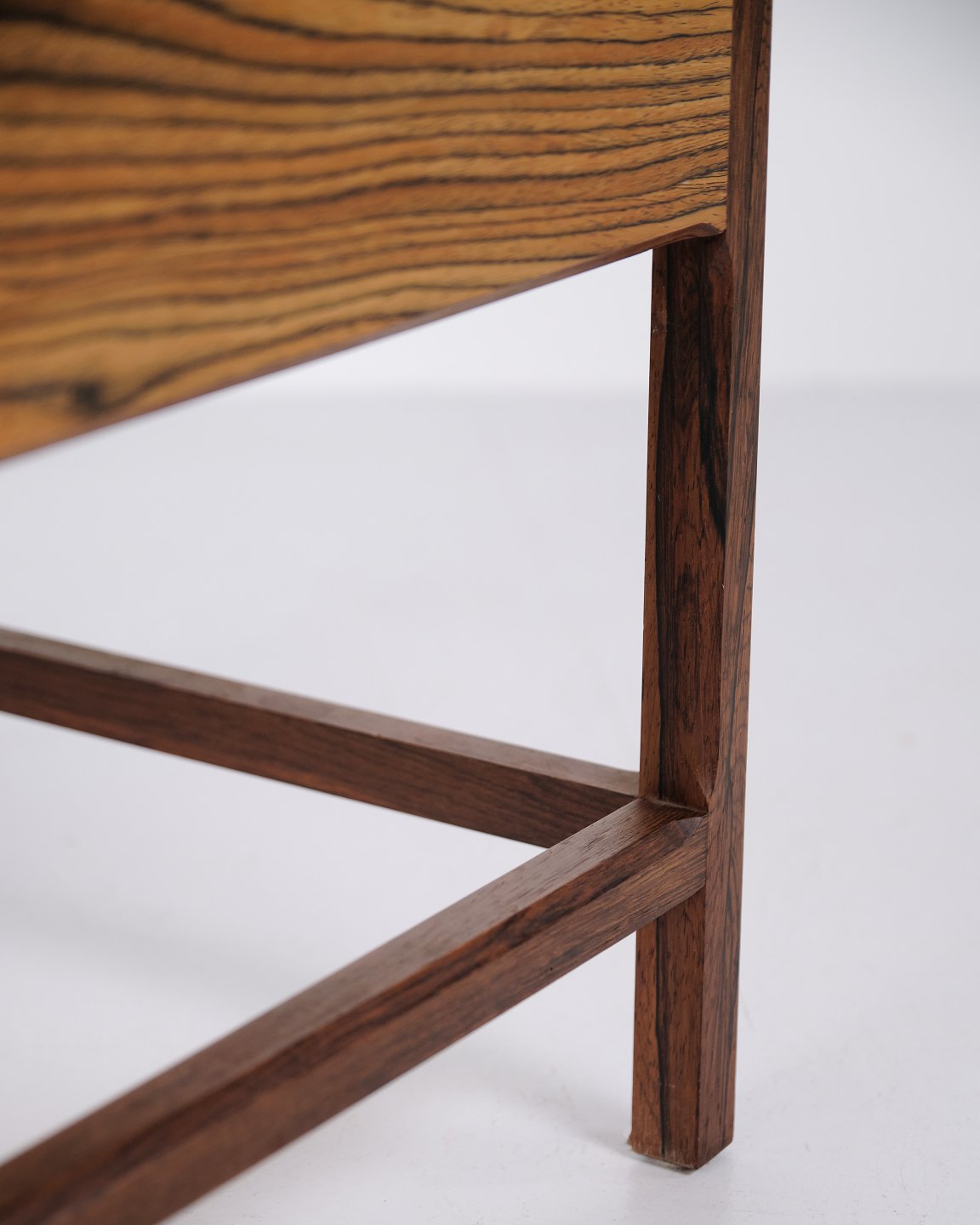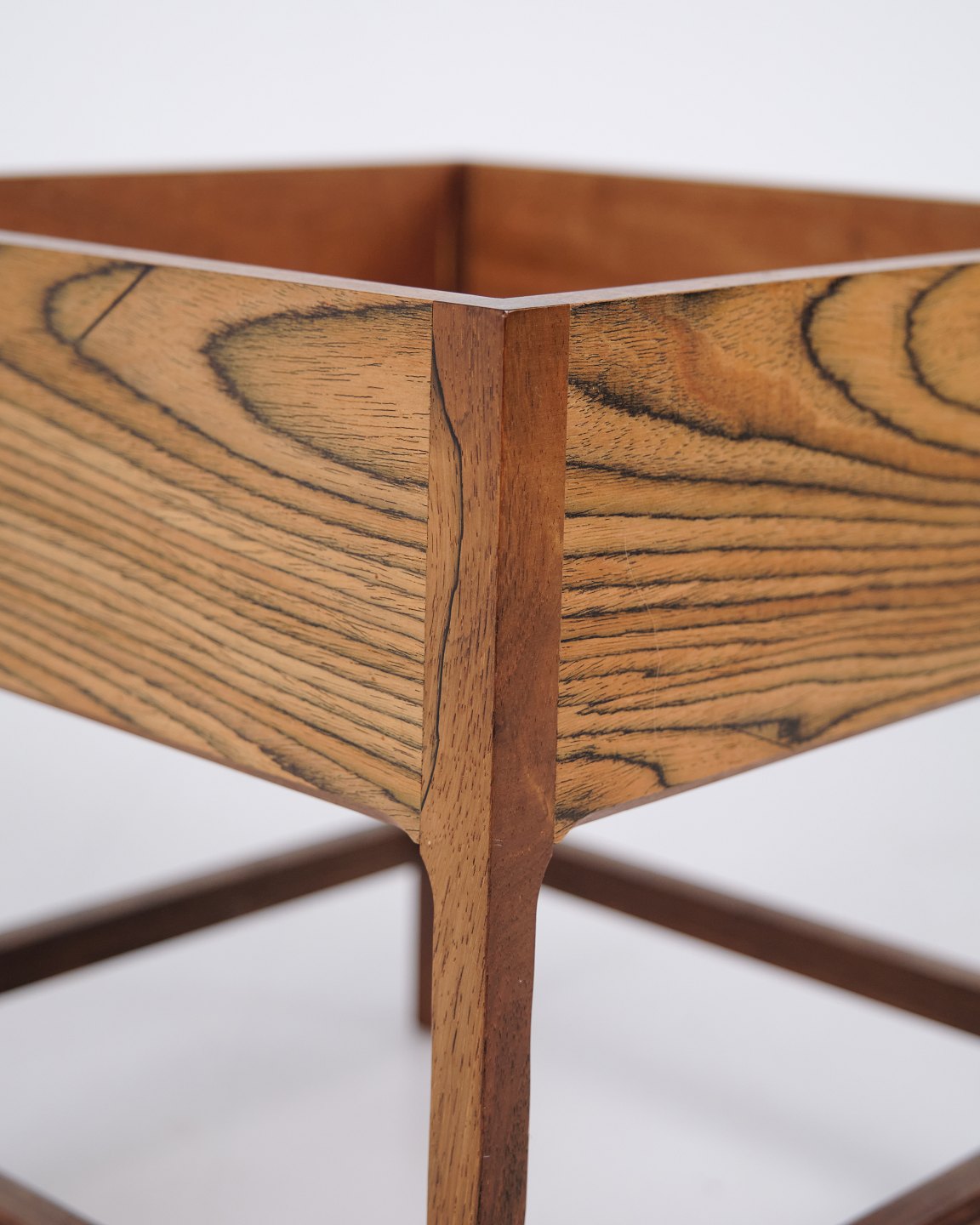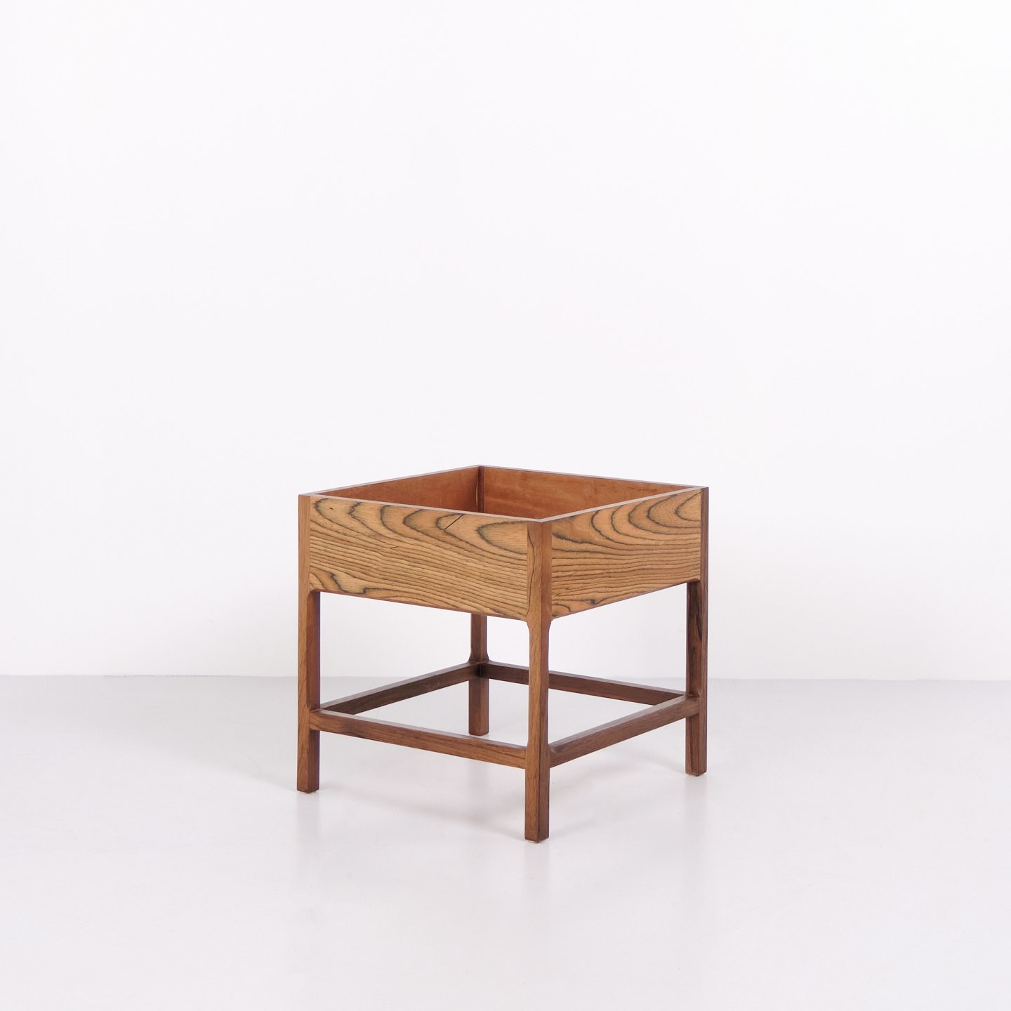 Blomsterkasse designet af Kai Kristiansen for Aksel Kjersgaard i 1960’erne. Udført i palisander med markant åretegning og fine snedkerdetaljer. Den kvadratiske form og hævede konstruktion afspejler de rene linjer i dansk modernisme. Aksel Kjersgaard var kendt for høj kvalitet og samarbejder med flere toneangivende danske designere. Velegnet som blomsterkumme, interiørmøbel eller opbevaring.