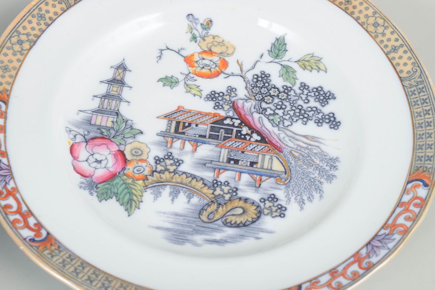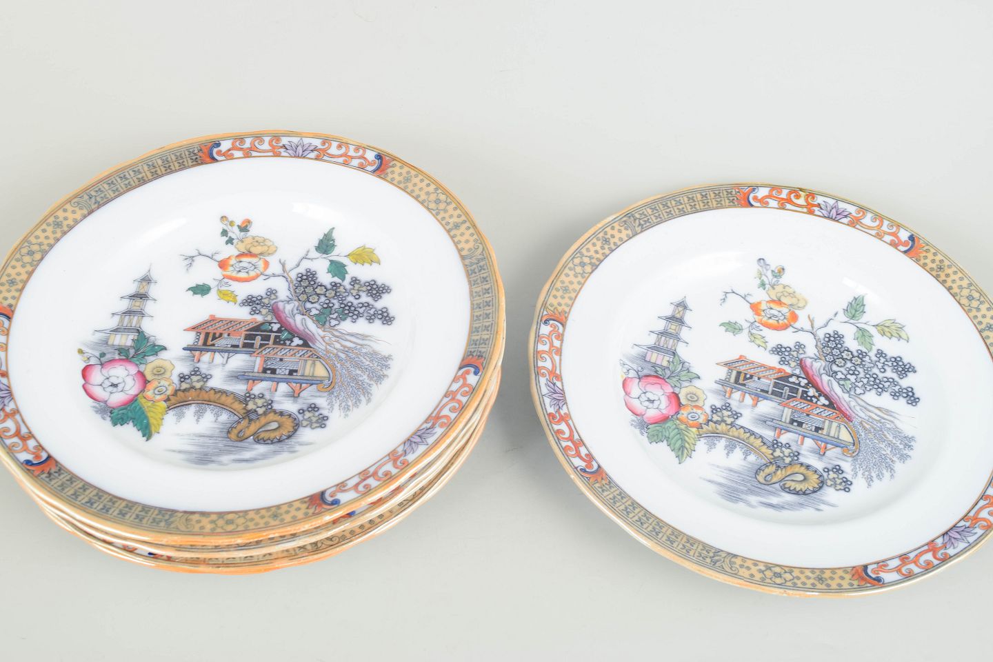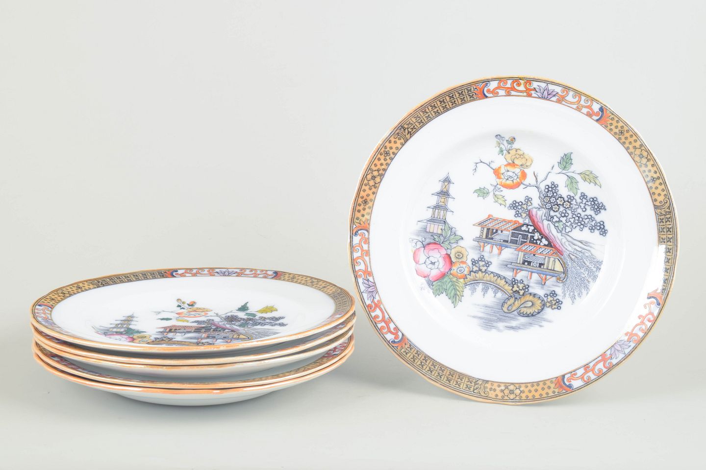 Middagstallerkener i fajance med orientalsk inspireret dekoration i polykrome farver og detaljerig bemaling i japansk stil, karakteristisk for Rörstrands japanismeproduktion fra begyndelsen af 1900-tallet.