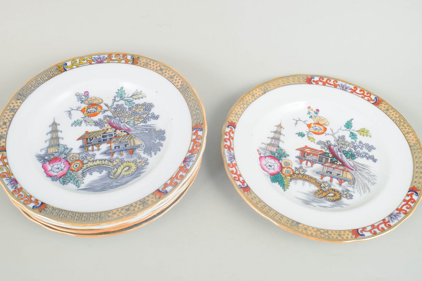 Middagstallerkener i fajance med orientalsk inspireret dekoration i polykrome farver og detaljerig bemaling i japansk stil, karakteristisk for Rörstrands japanismeproduktion fra begyndelsen af 1900-tallet.
