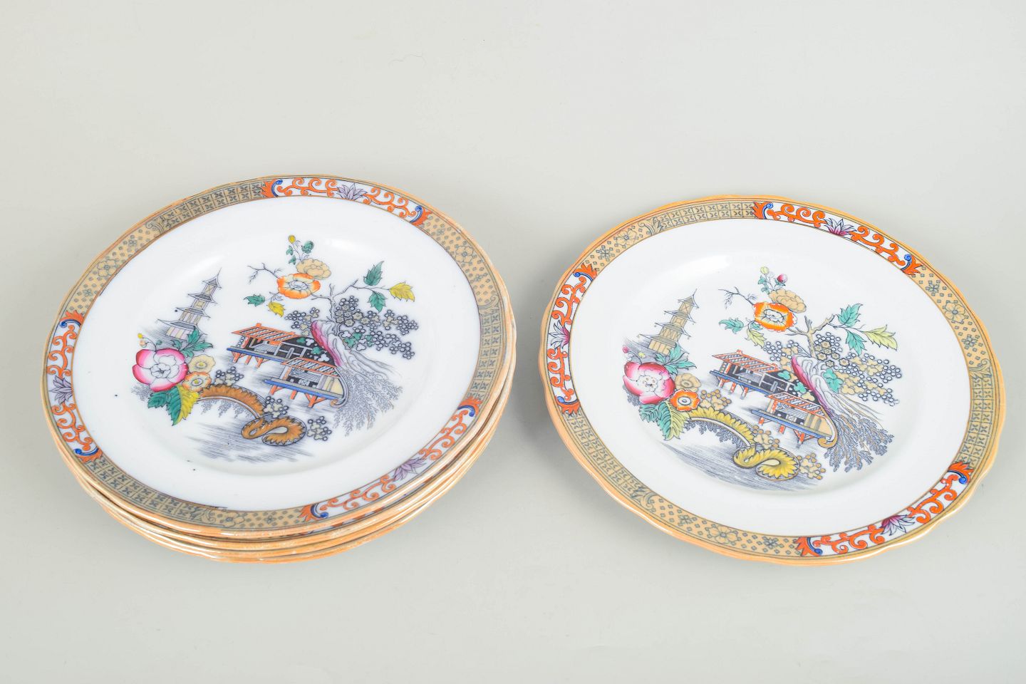 Middagstallerkener i fajance med orientalsk inspireret dekoration i polykrome farver og detaljerig bemaling i japansk stil, karakteristisk for Rörstrands japanismeproduktion fra begyndelsen af 1900-tallet.