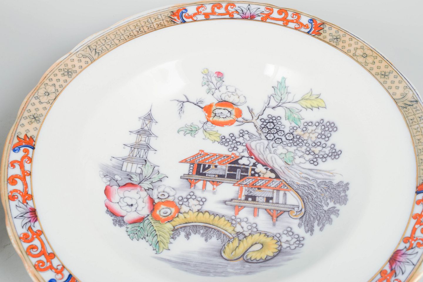 Dybe tallerkener i fajance med orientalsk inspireret dekoration i polykrome farver og detaljerig bemaling i japansk stil, karakteristisk for Rörstrands japanismeproduktion fra begyndelsen af 1900-tallet.