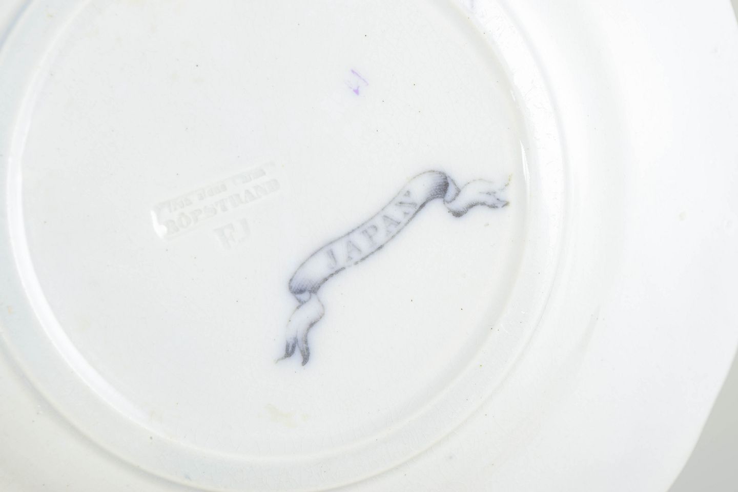 Flade tallerkener i fajance med orientalsk inspireret dekoration i polykrome farver og detaljerig bemaling i japansk stil, karakteristisk for Rörstrands japanismeproduktion fra begyndelsen af 1900-tallet.