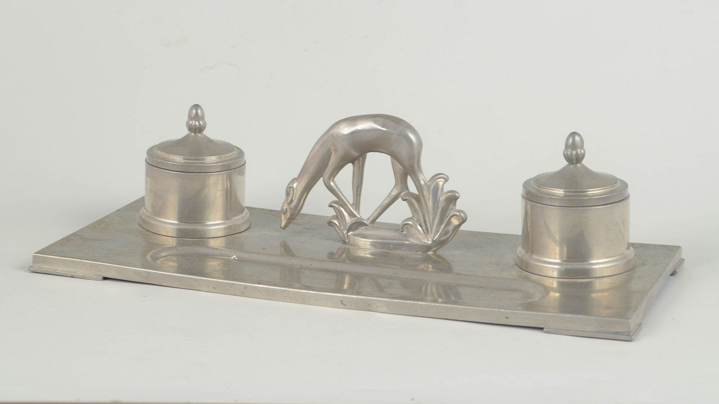 Rektangulært blækhus i tin med to beholdere og dekorativ hjortefigur i midten. Den ene glasindsats mangler. Stemplet under bunden.