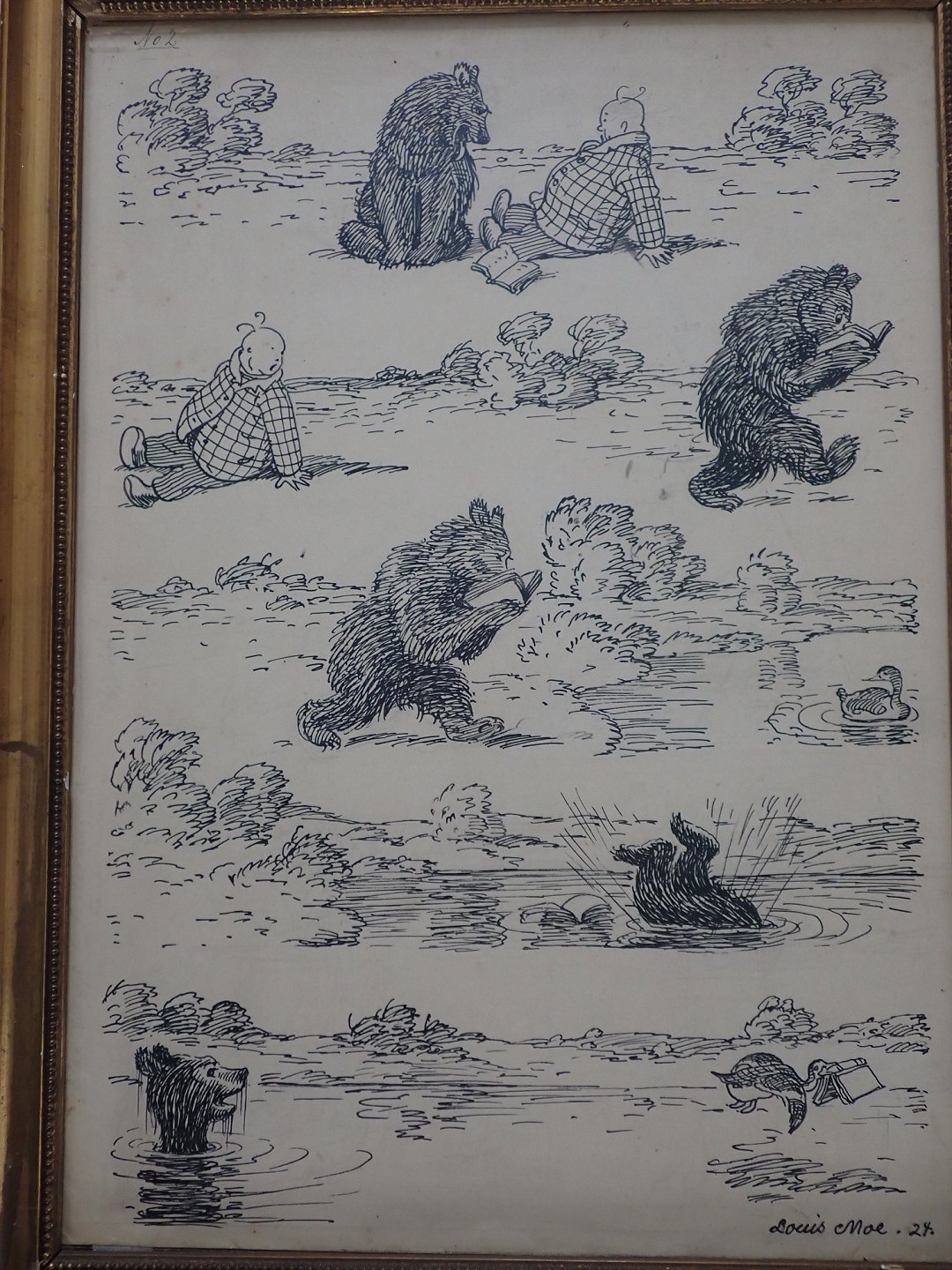 Louis Moe (1857 -1945) - Indrammet humoristisk tushtegning på papir Signeret Louis Moe - 24. Mål: 42 x 30 cm (47 x 34). Bagsiden består pap påklistret en radering af en portugisisk konge. I pæn stand, svagt guldnet.