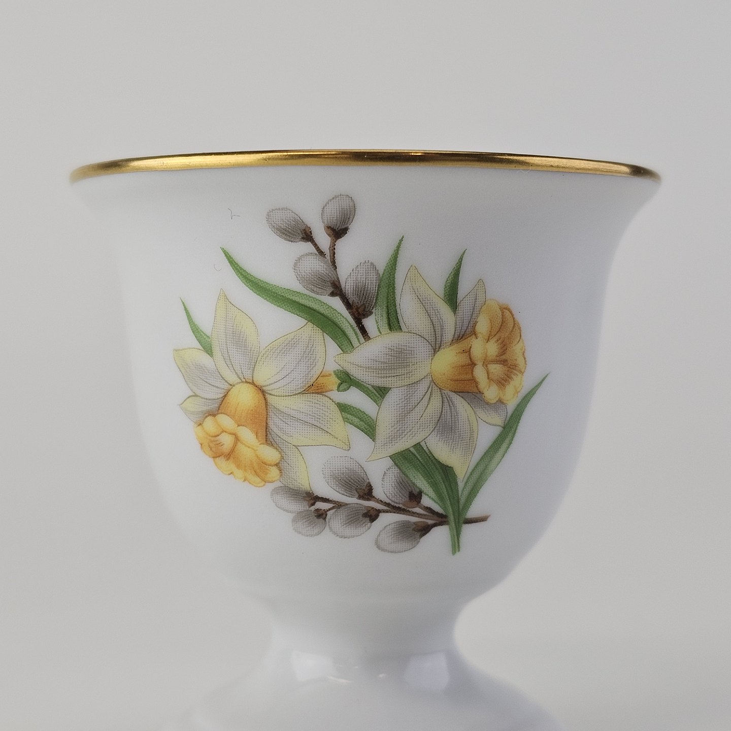 Bæger i hvidt porcelæn med guldkant og motiv af påskelilje