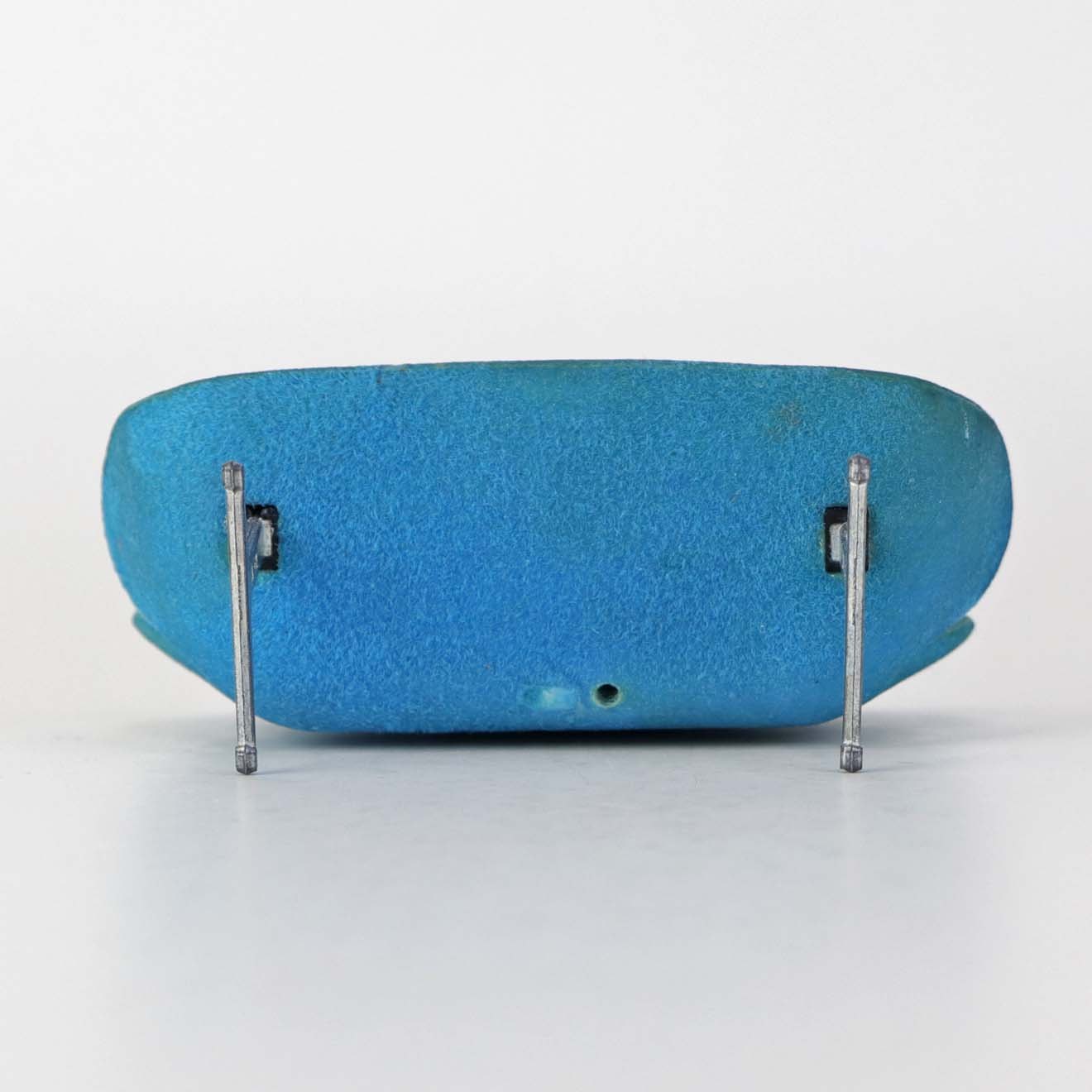 Miniature designermøbel til dukkehus med model af Arne Jacobsen's Svanesofa i blå farve med stel i metal.
