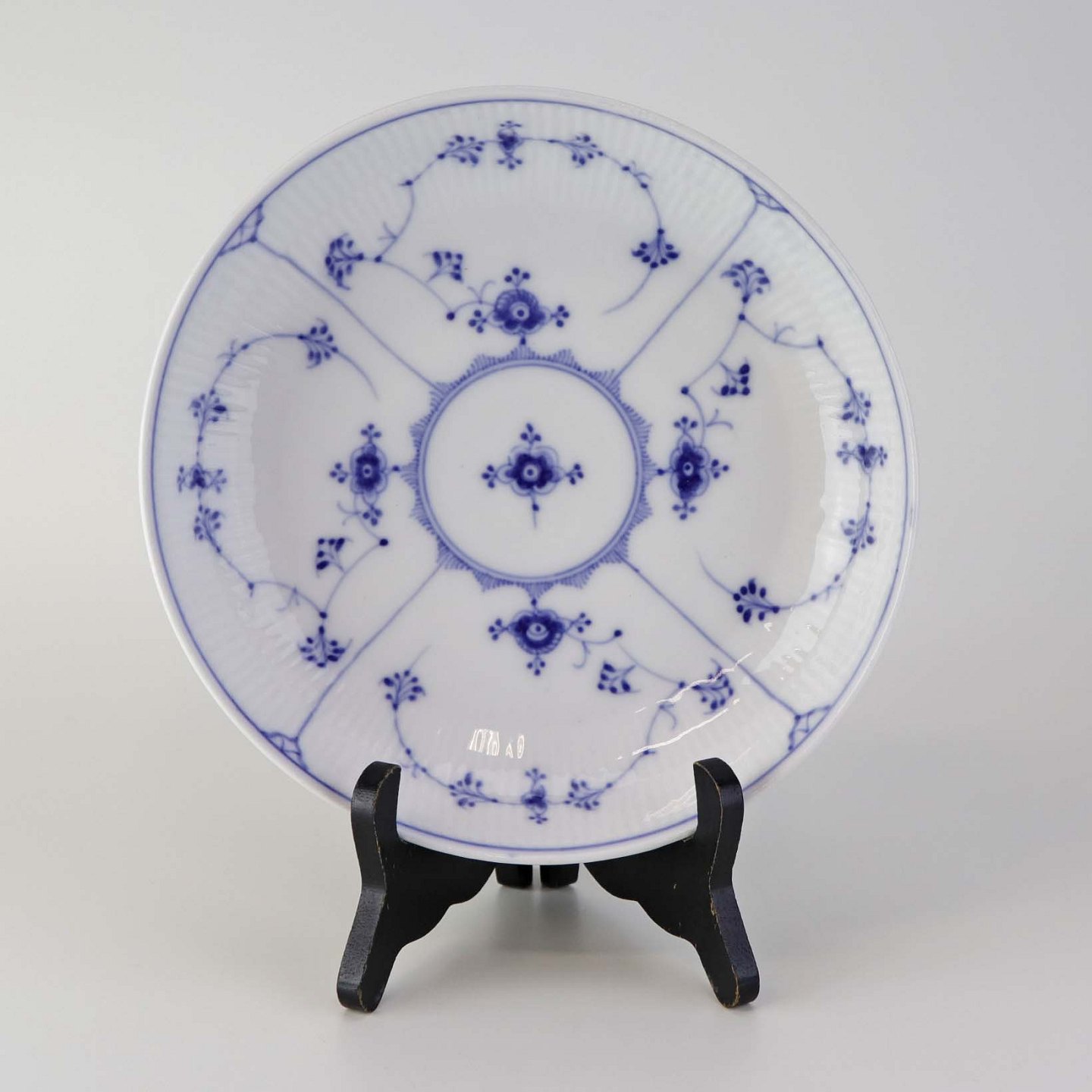 Musselmalet er af kongeligt hvidt porcelæn, dekoreret med rifler og mønster af blå ranker og blomster.