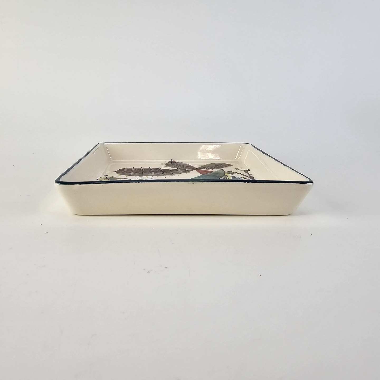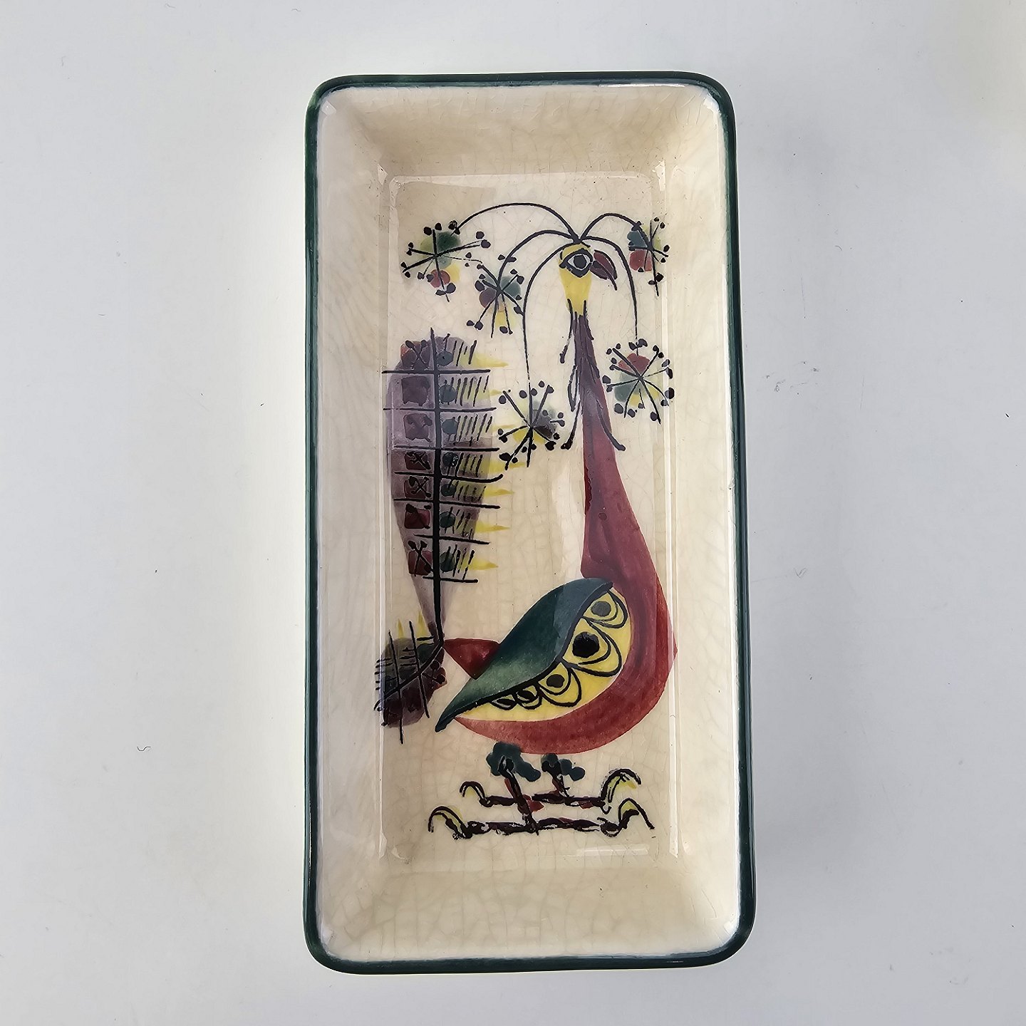 Cabaret fad fra serien Tenera med bakke i teak træ og fem små, firkantede fade i fajance med dekoration af påfugle