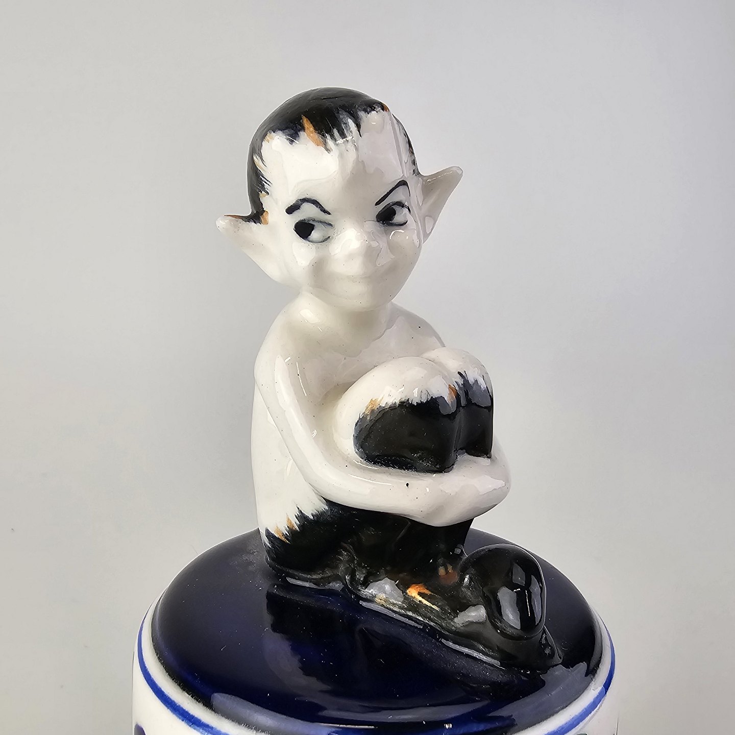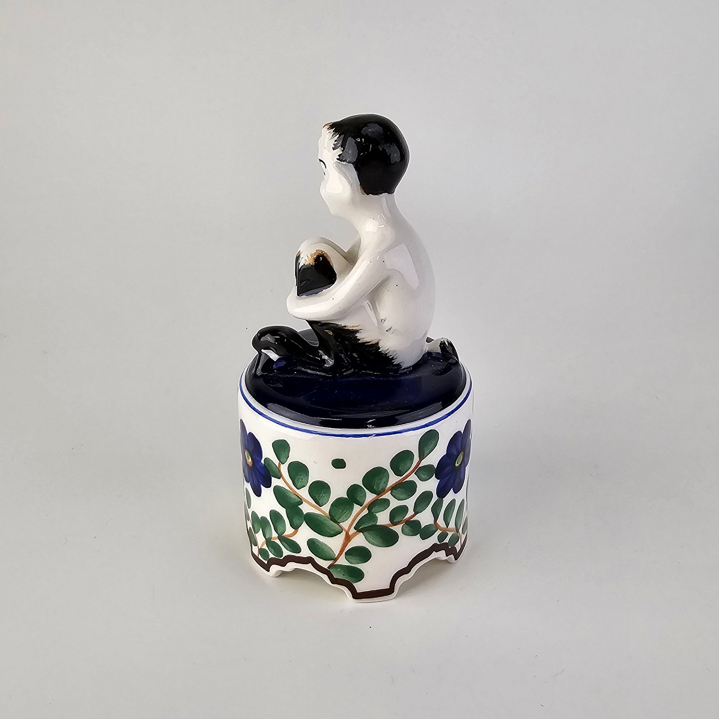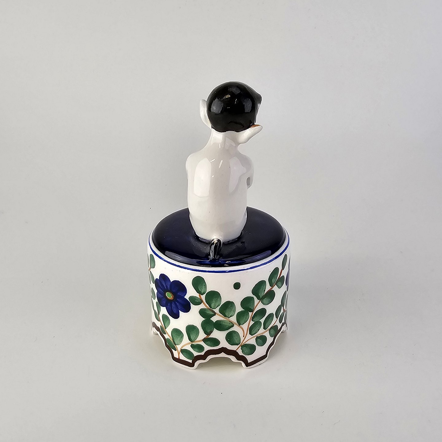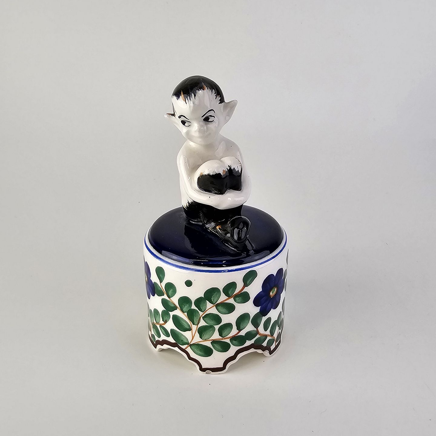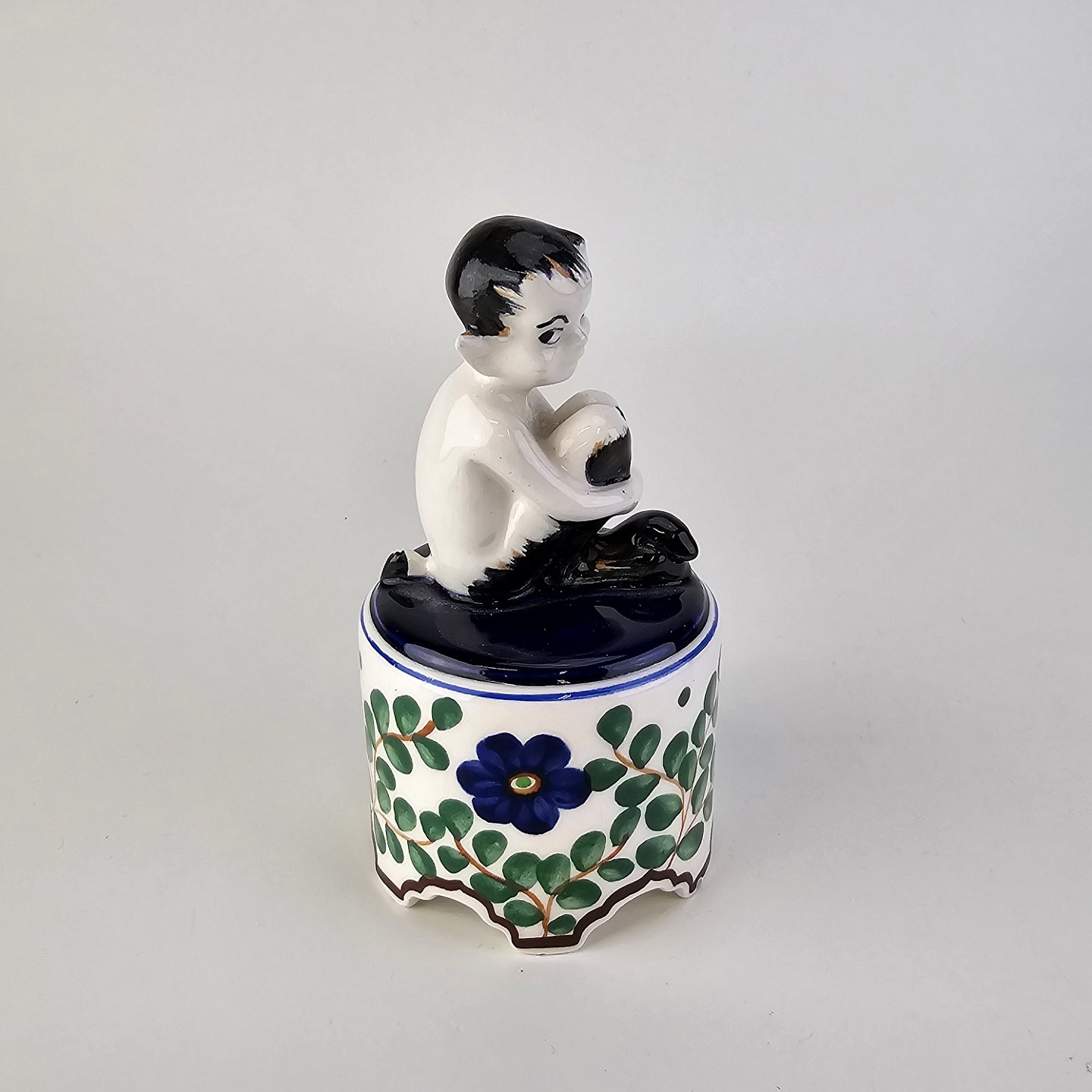 Figur i fajance med motiv af en faun på en opsats med malet blomstermotiv