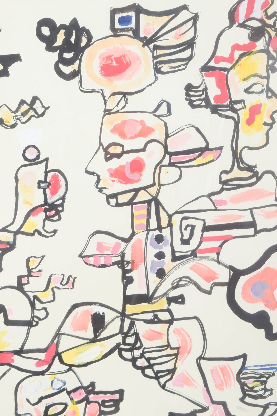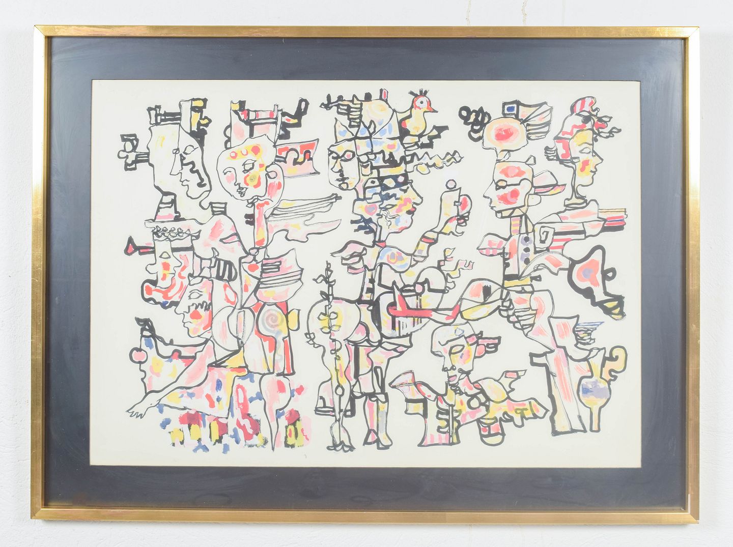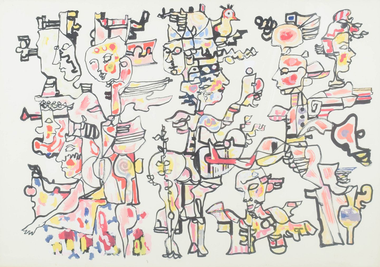 Kompleks figurkomposition med stiliserede og fragmenterede menneskefigurer opbygget i et dekorativt, næsten mosaiklignende formsprog. Værket er udført med karakteristisk lineær struktur og farvefelter i varme nuancer, signeret og dateret 1970.