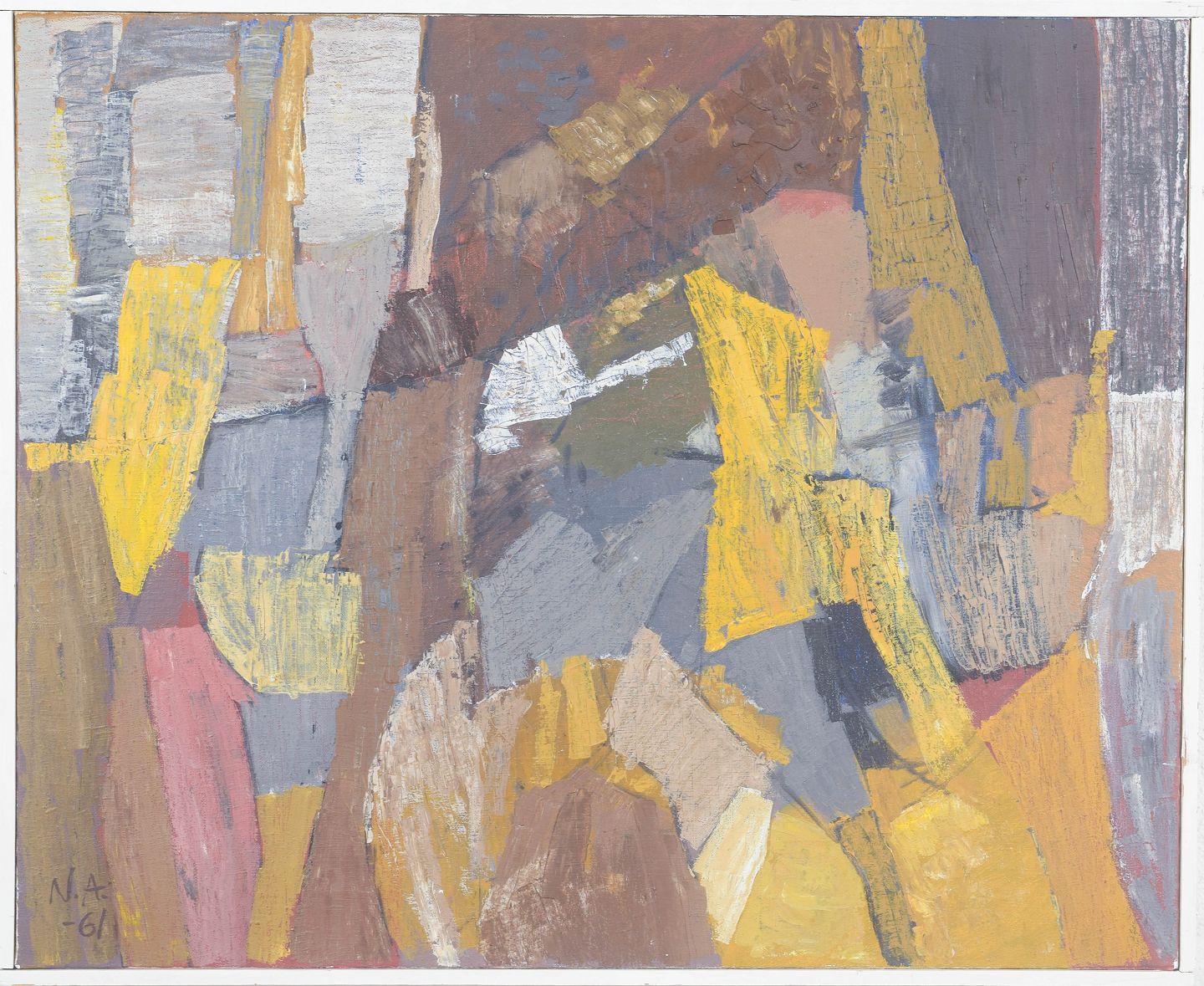 Abstrakt komposition med kraftfuld pensel- og paletknivsføring i jordfarver og gule nuancer. Titel : “från Hven – Backafallen”, signeret og dateret 1961.