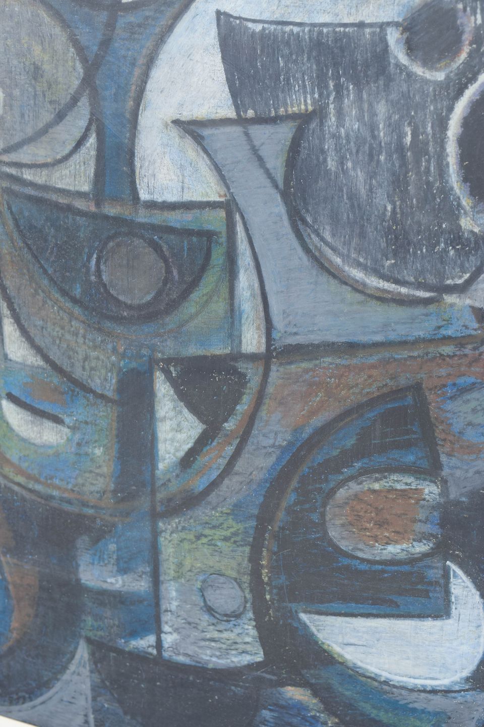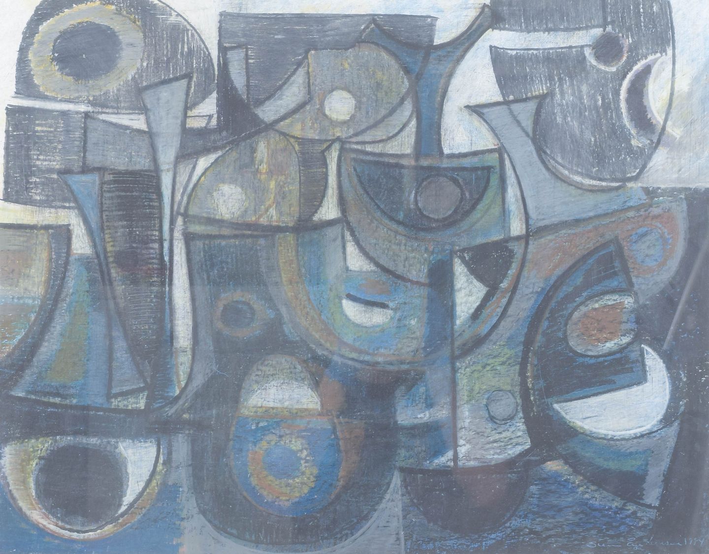 Nonfigurativ abstrakt komposition i blå og grå nuancer med organiske og geometriske former, udført i farvekridt på papir, monteret bag glas. Signeret og dateret 1984.