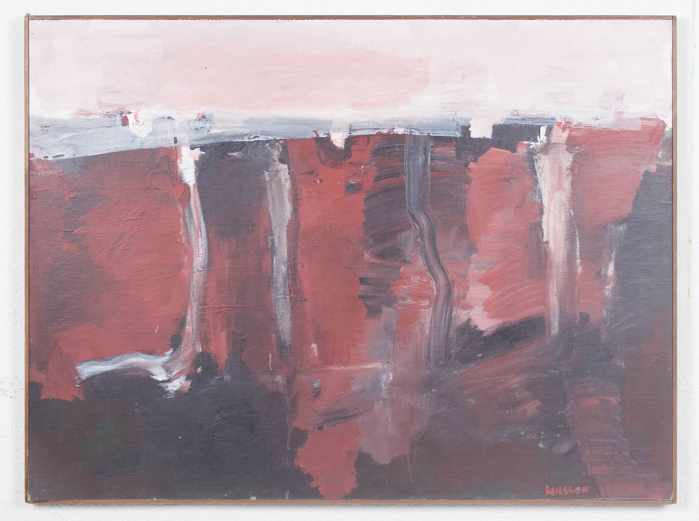 Abstrakt komposition udført i olie på plade med ekspressiv penselføring og lagdelte farvefelter i dæmpede rødlige og grå toner. Kompositionen fremstår med en balanceret spænding mellem struktur og spontanitet, signeret.