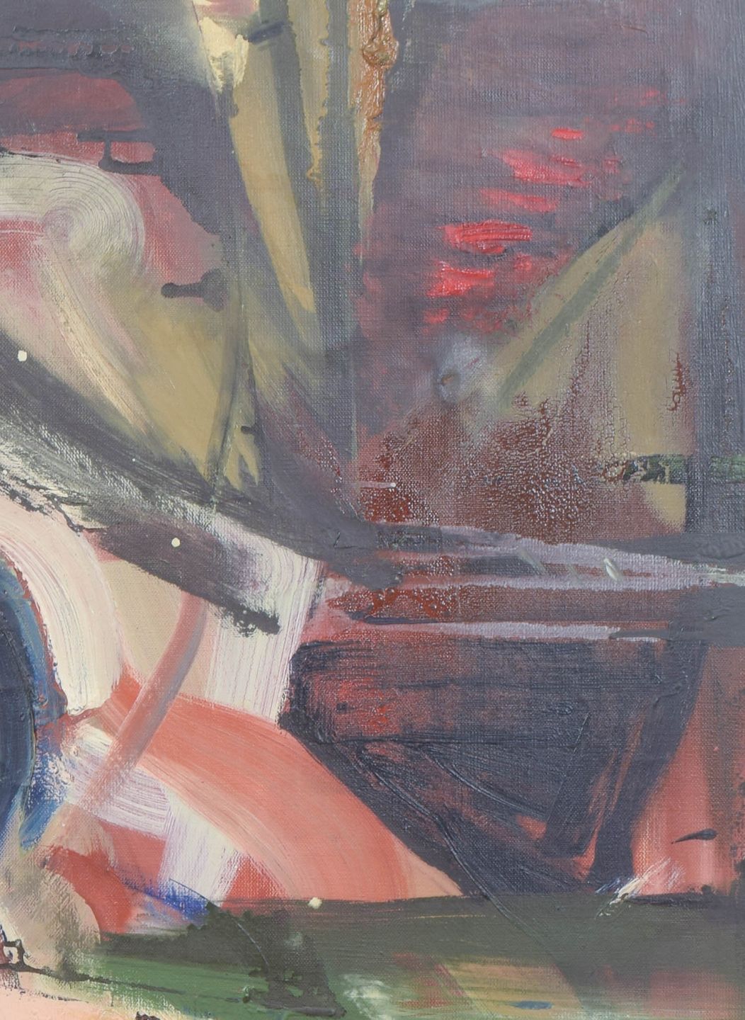 Ekspressiv modernistisk komposition med dynamiske penselstrøg og geometrisk-opløste former i en levende farvepalet. Motivets struktur antyder arkitektoniske elementer og rumlige spændinger, udført med en fri og gestisk tilgang. Olie på lærred, usigneret.
