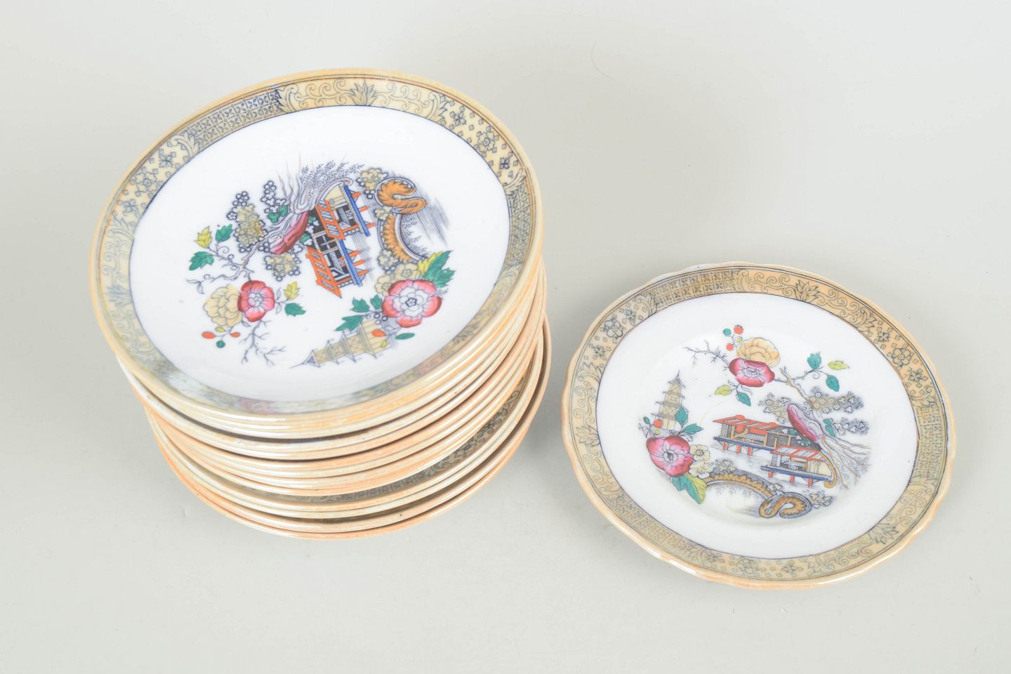 Dekorative små tallerkener i fajance med polykrom dekoration i orientalistisk japansk stil med pagodemotiv, bygninger, fugl og blomster. Model Japan, produceret i perioden 1866–1925 og dateret til 1880’erne.