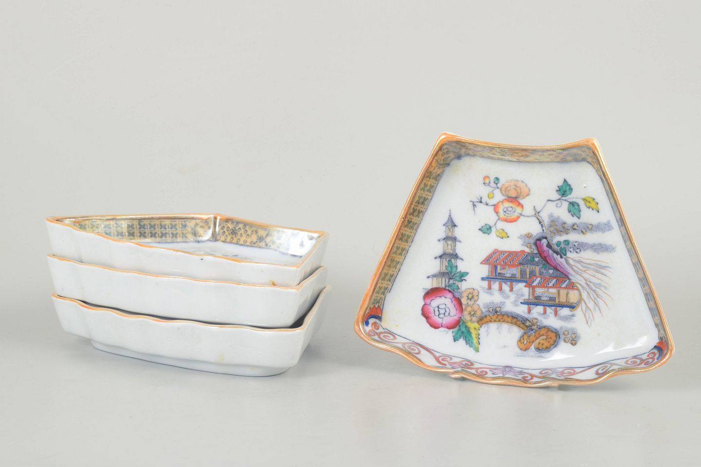 Dekorative firkantede fade i fajance med polykrom dekoration i orientalistisk japansk stil med pagodemotiv, fugl og blomster. Model Japan, produceret i perioden 1866–1925 og dateret til 1880’erne.