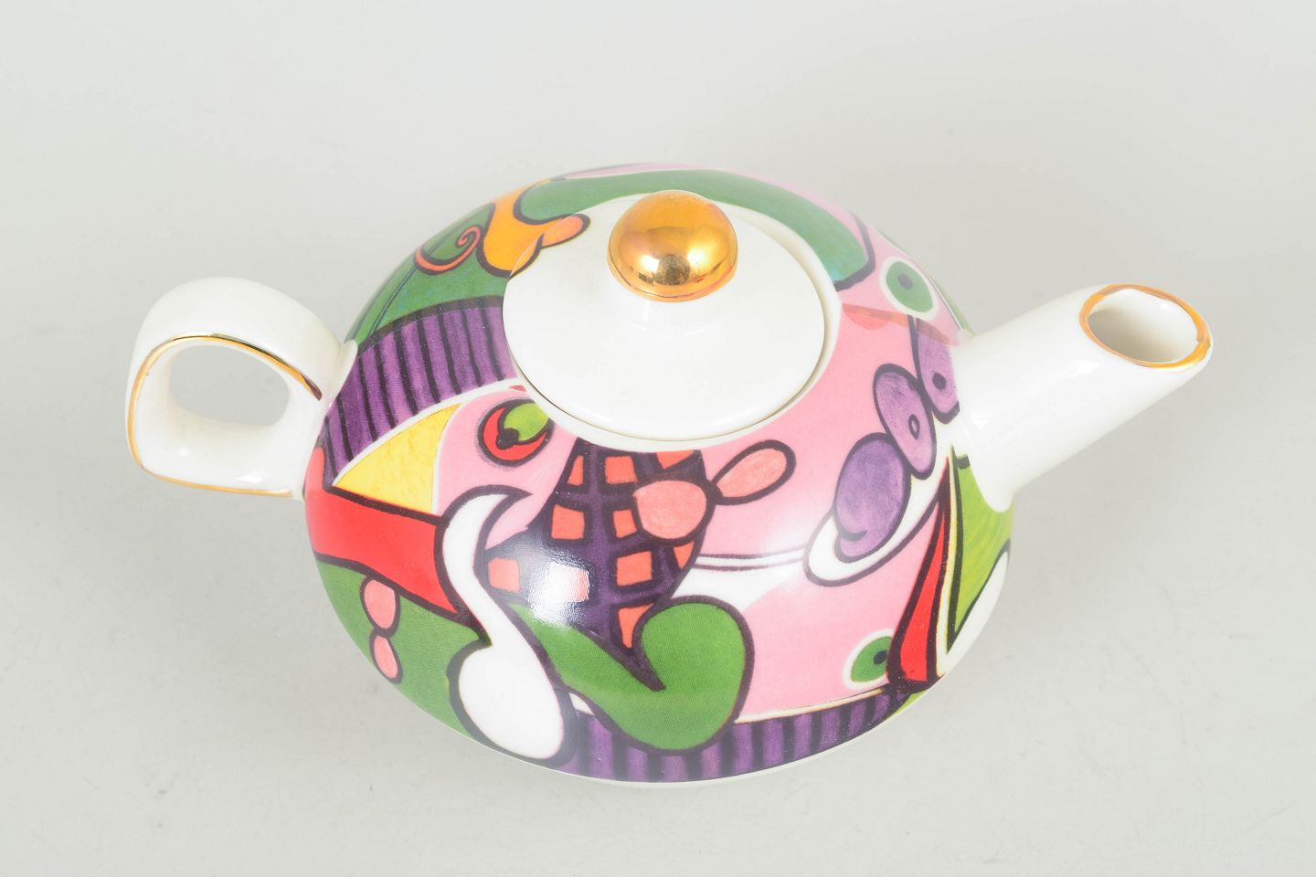 Tekande i porcelæn med låg, mærket Picasso. Rundet form med farverig dekor i stærke kontraster samt guldkant på knop og tud, typisk for sen 1900-tals produktion.