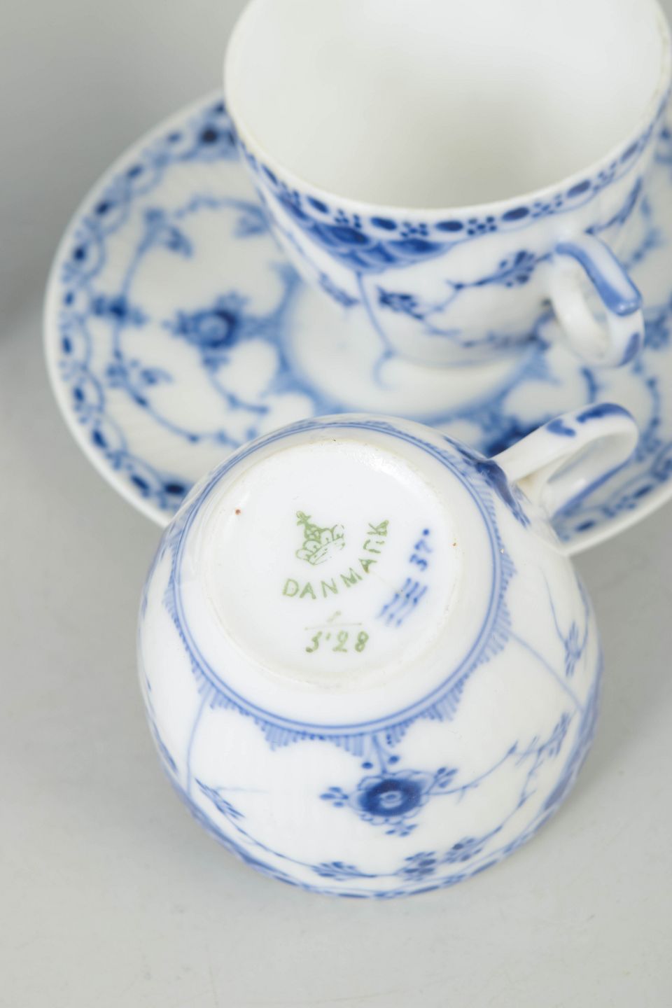 Håndmalede kaffekopper med underkopper i porcelæn med musselmalet halvblonde dekoration, model 1/528, dele med fabriksannullering markeret med én indridset streg.