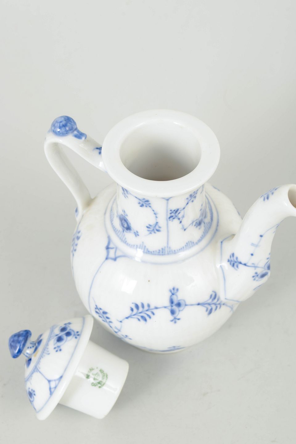 Håndmalet espressokande i porcelæn med klassisk musselmalet riflet dekoration, model 1/45, første sortering.