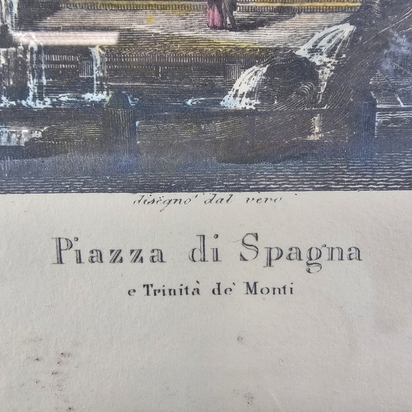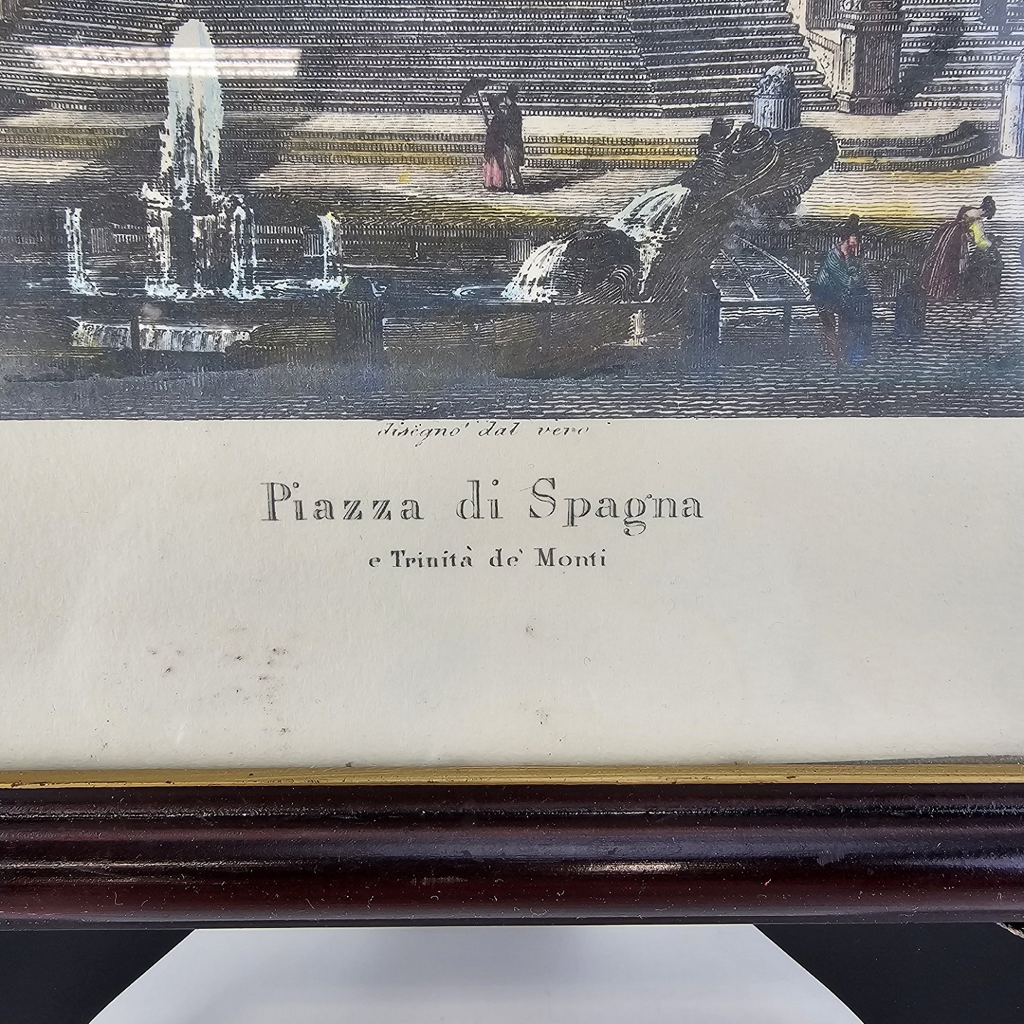 Bogtryk på papir med motiv af Piazza di Spagna i Rom, monteret i sort ramme
