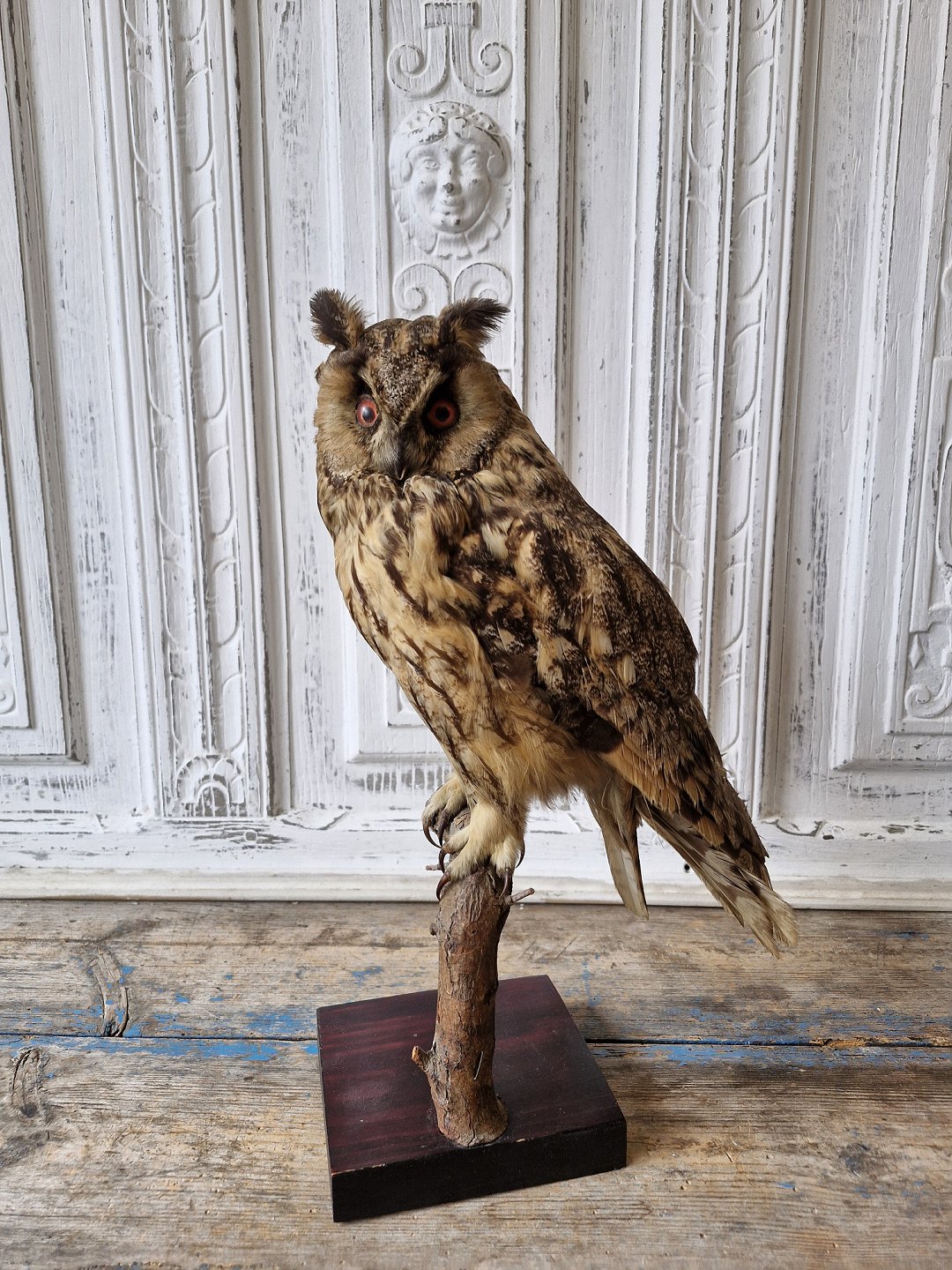 Udstoppet skov hornugle i flot stand monteret på natur gren