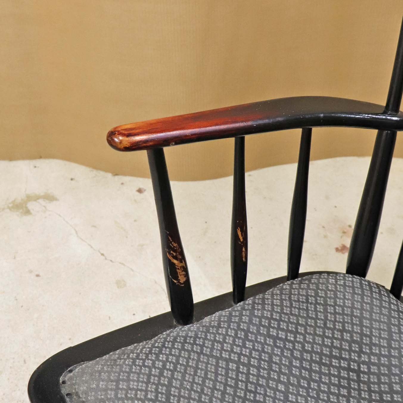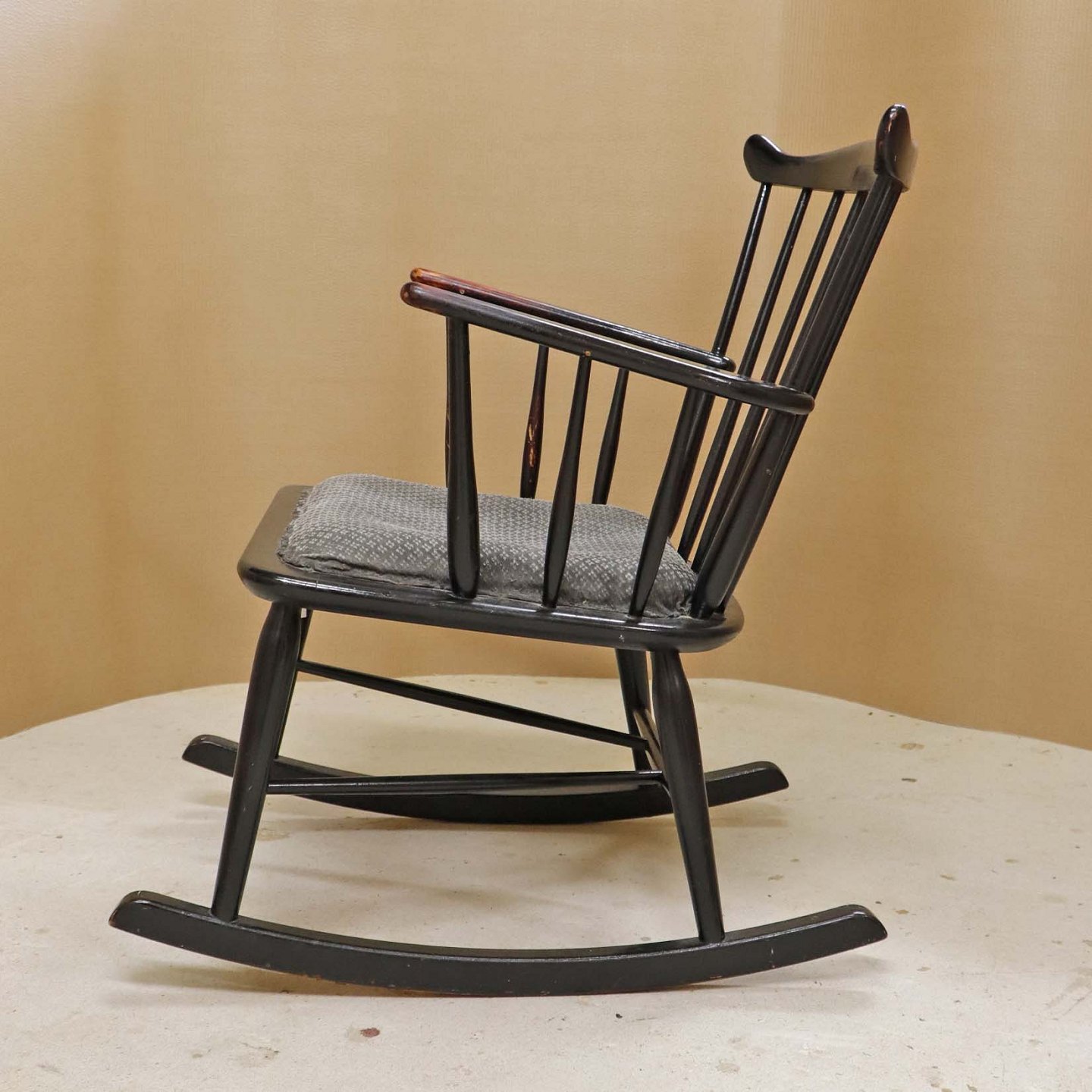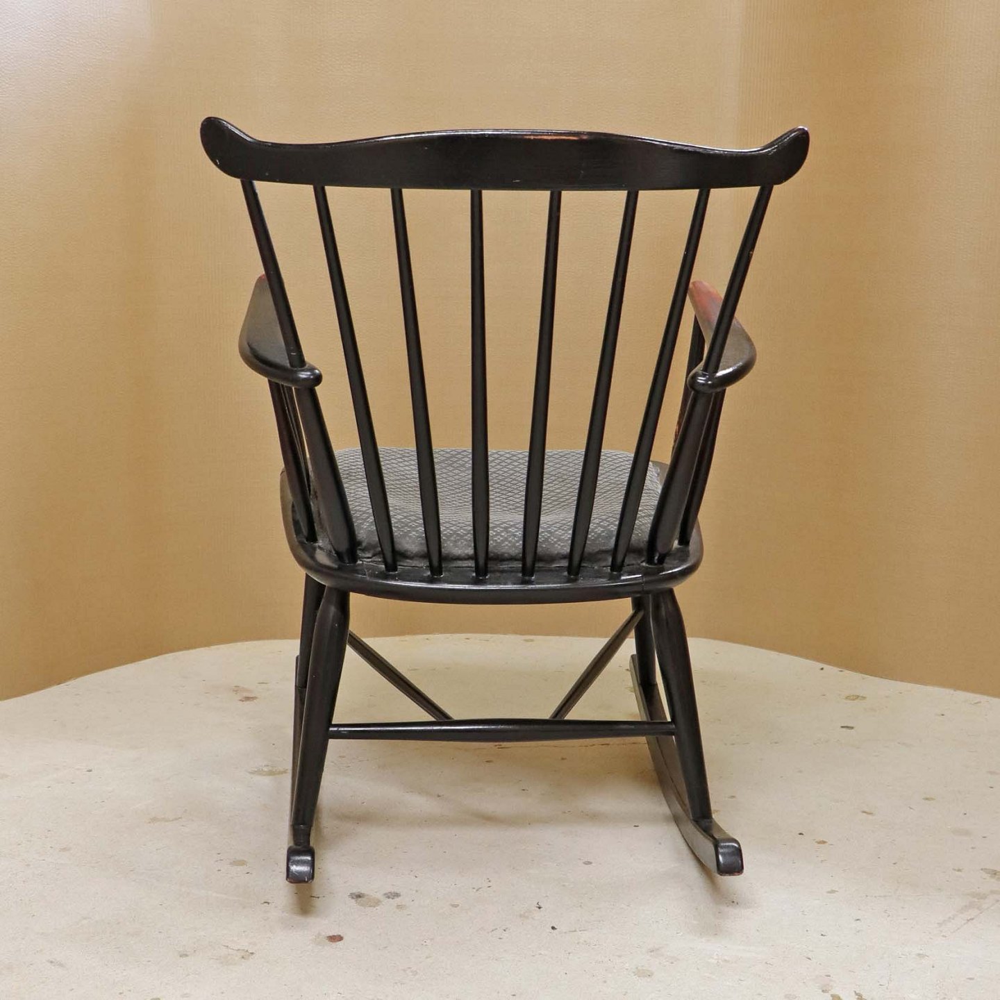 Tremme gyngestol i sortlakeret træ med fastmonteret polstret stofbetrukket sæde i grå farve med lyst mønster. Model 181