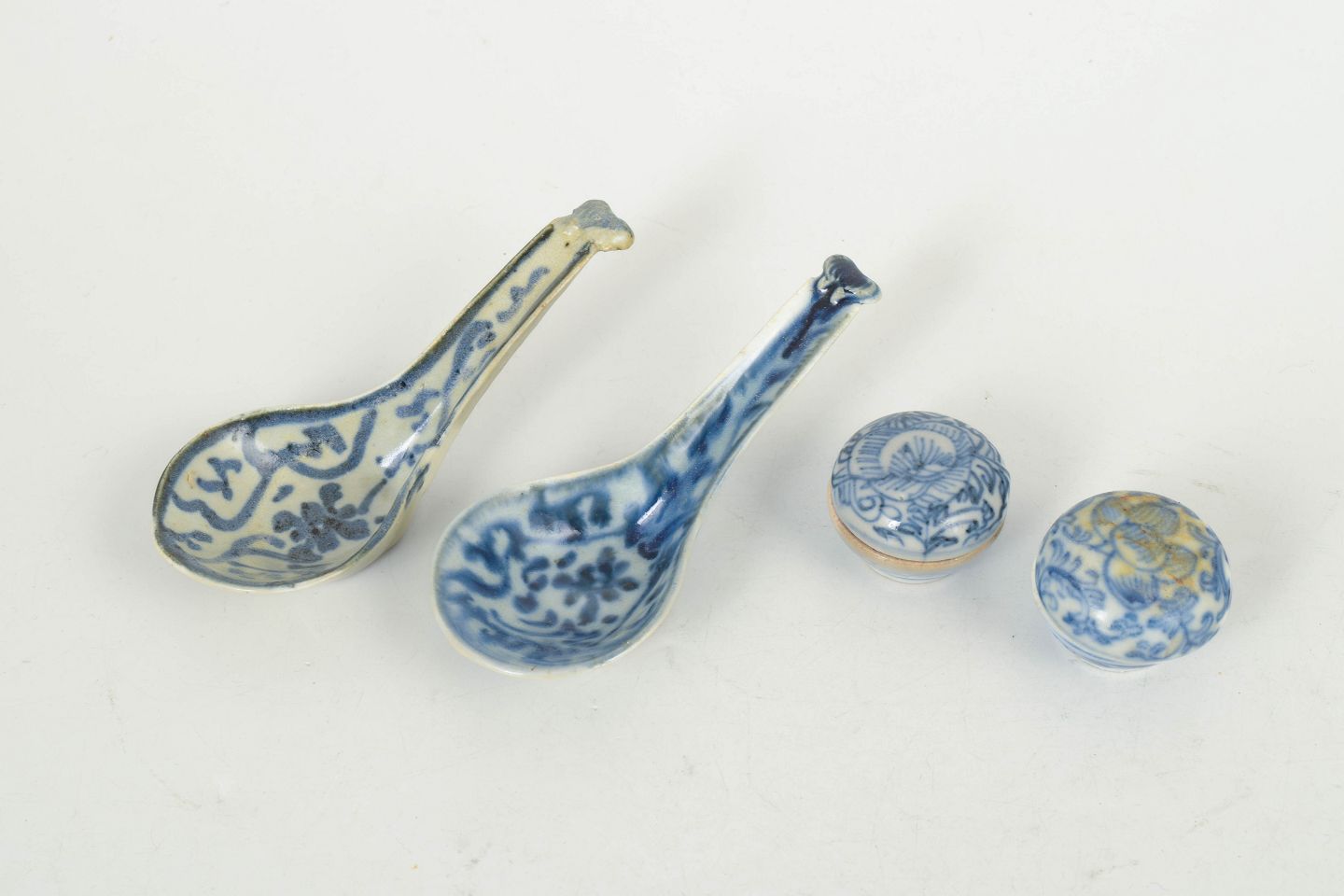 To porcelænsskeer med blå underglasurdekoration fra Qing-dynastiet samt to små lågæsker i porcelæn med blå dekoration, ligeledes fra Qing-perioderne, udført i klassiske former.