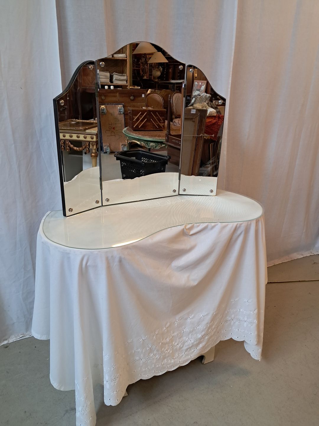 Marie Antorinette sminkebord med spejl og glasplade, fra 1950erne.