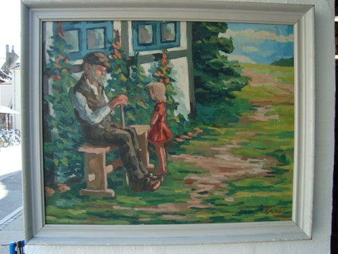Maleri Bendt Lauridsen - Gammel mand i samtale med pige ved bondehus.
