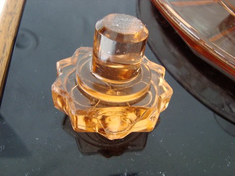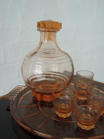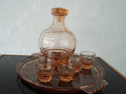 Art Deco likørsæt i jordbærfarvet presset glas.