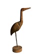 Sculptural and decorative bird carved from wood and standing on a wooden stand.