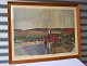 Farvelitografi af Ernst Syberg 1966 - Landskab med å løb og båd.