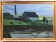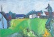 Maleri af Leo Thellefsen - landskab med huse og kvinde til hest.
