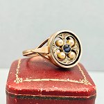 A ring in 9k gold set with sapphire, pearls and diamonds
