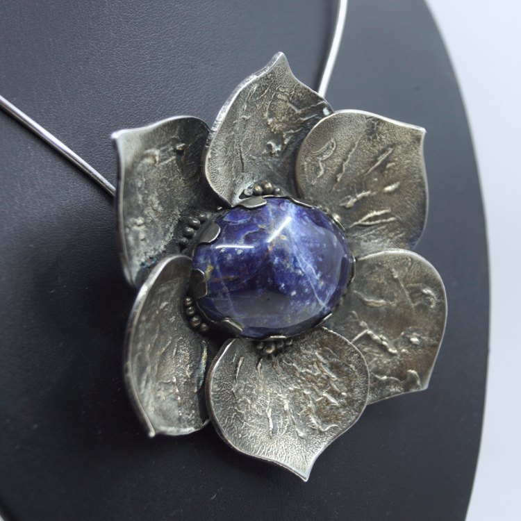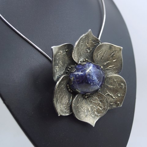 Birte Stenbak; Sterling silver necklace with a large flower adorned with a blue stone in the center. The necklace can be opened and can be adjusted to two different lengths.