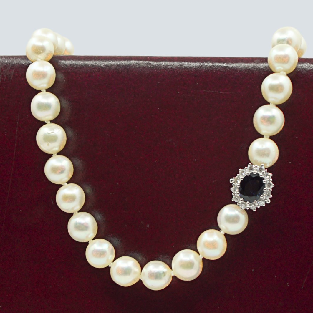 Hartmann's; Pearl necklace strung with knots between the pearls, set with a 18k white gold clasp. Clasp set with a sapphire, 1,86 ct., and several diamonds, total 0,36 ct. Top Wesselton VVS - VS. Clasp 1,2 - 1,4 cm. Length of the chain 45,7 cm. Pearl diam. app. 9 mm.