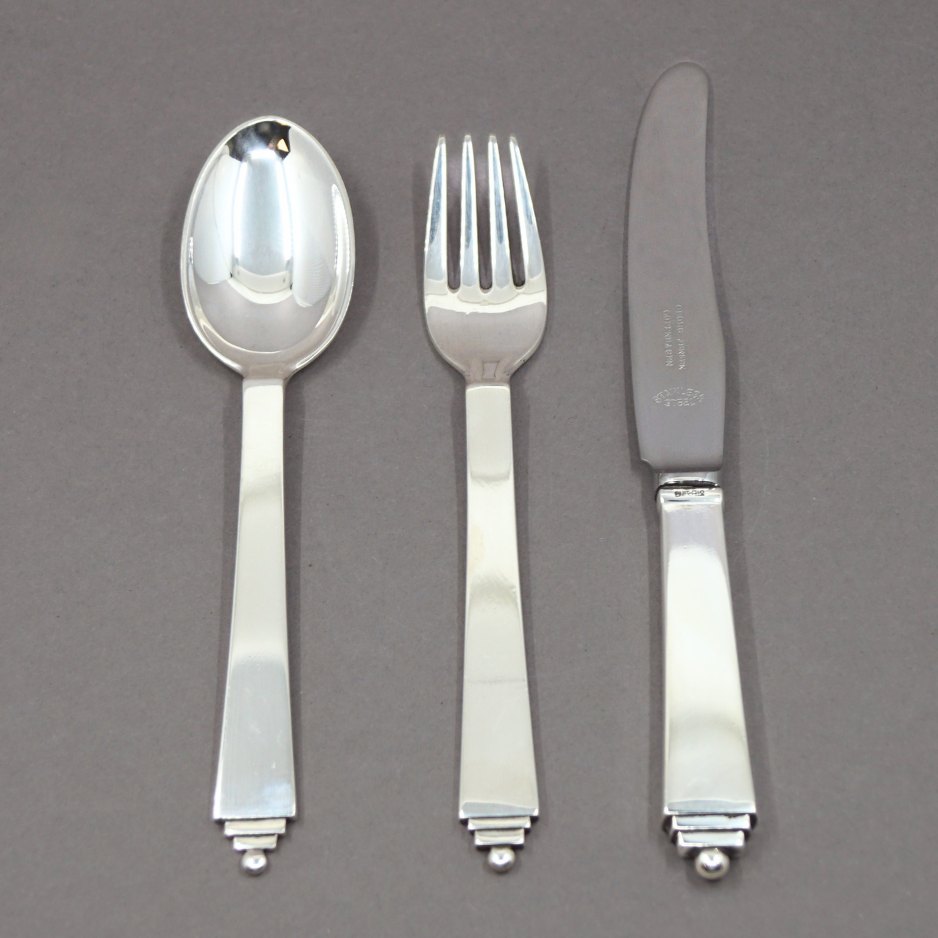 Georg Jensen; A pyramid children cutlery made in sterling silver, three pieces. Child spoon l. 14,2 cm,