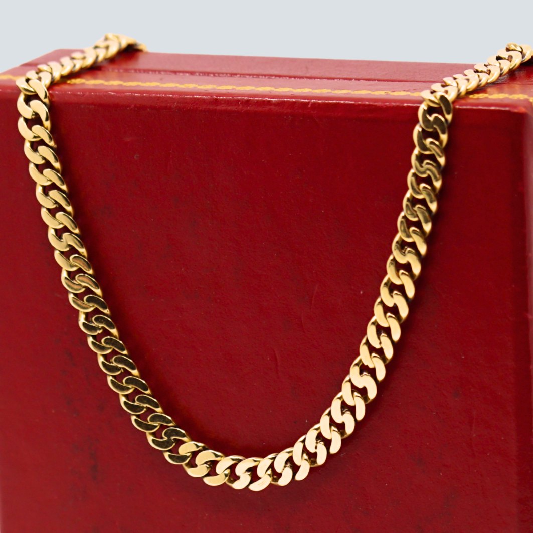 A neckalce of 14k gold. Clasp with two safety catches. L. 51 cm. W. 5 mm. 27.5 gram. Stamped "585". Danish jewellery. Please contact us if you're looking for anything specific. What you see on our webside is just a small selection.