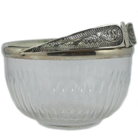 Sukkerkumme i klart glas med slibninger, monteret med hank i filigran sølv. Sukkerskål Danmark omkring 1860. H. 7,5 cm. Diam. 12 cm.
