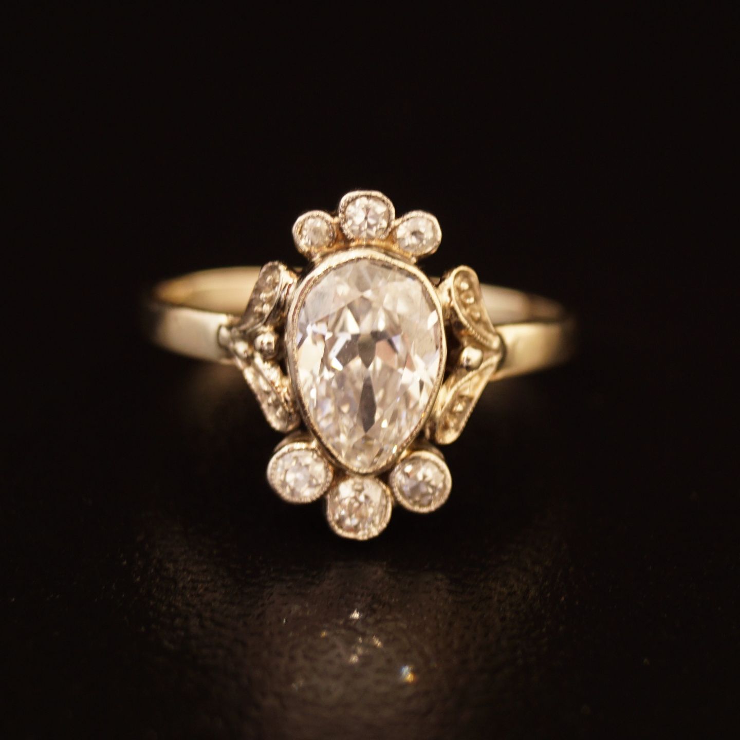 Brillantsmykke fra starten af 1900-tallet. Hvidguldsring af 14 kt. guld, prydet med en større dråbeformet brillant på 1,25 carat. Farve: Top Crystal, VVS. og 6 små diamanter i alt ca. 0,15 ct. Ring str. 55.