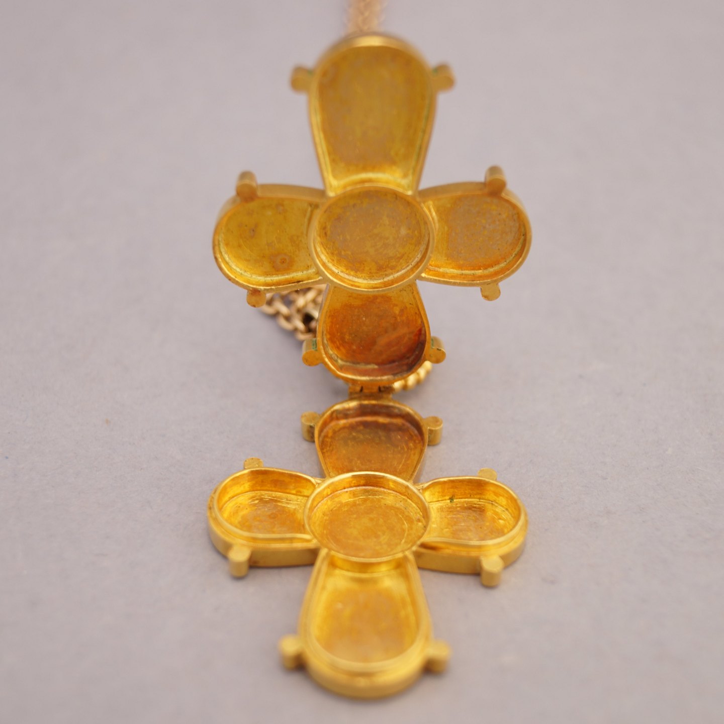 Dagmarkors i 14k guld med emalje og som medaljon der kan åbnes. Fra år 1900-1920. H. 3,5 cm. B. 3 cm. D. 0,5 cm. Kæde: 61 cm.
