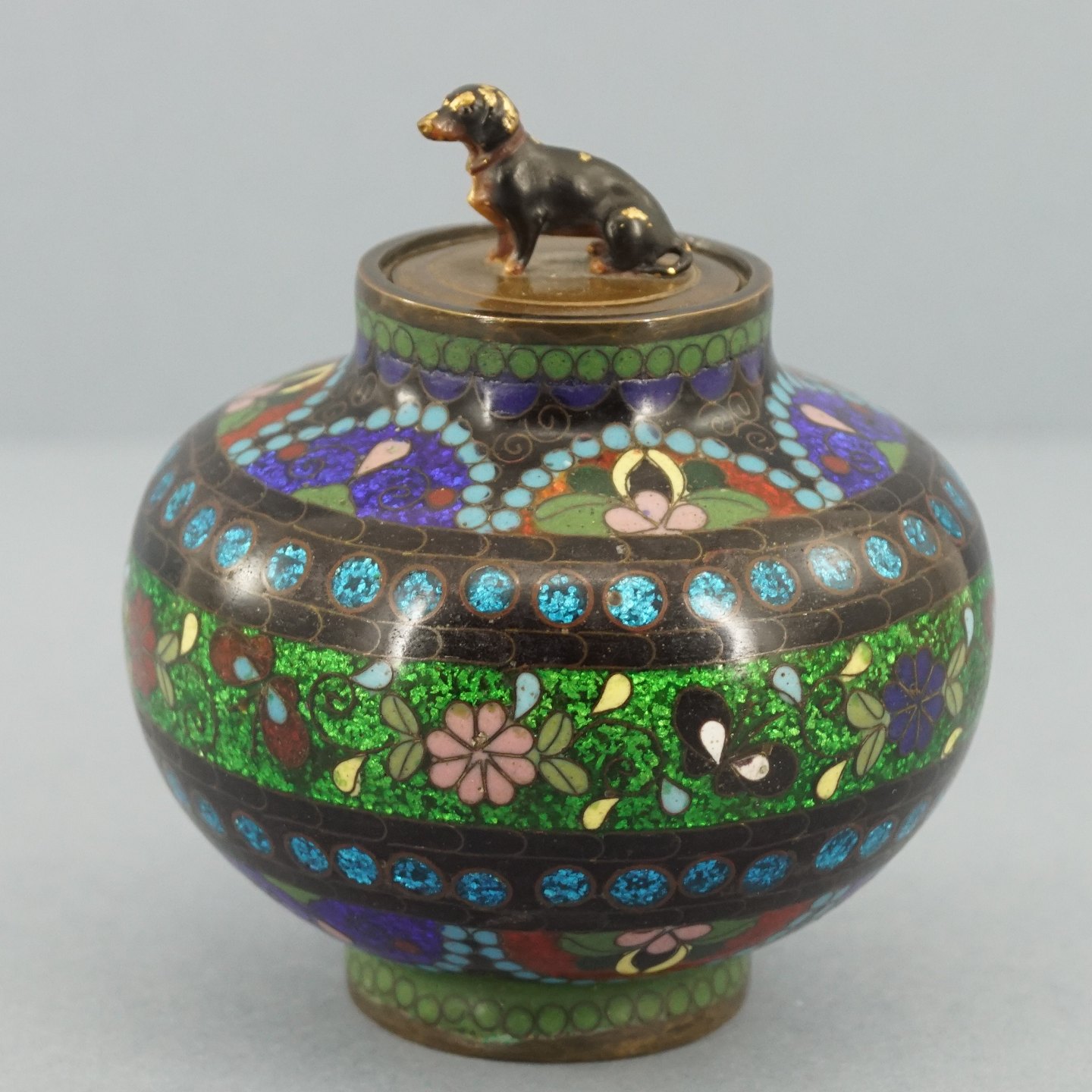 En cloisonne lågkrukke prydet med en gravhund i wiener bronze på låget. H. 8,5 cm. Start 1900-tallet.